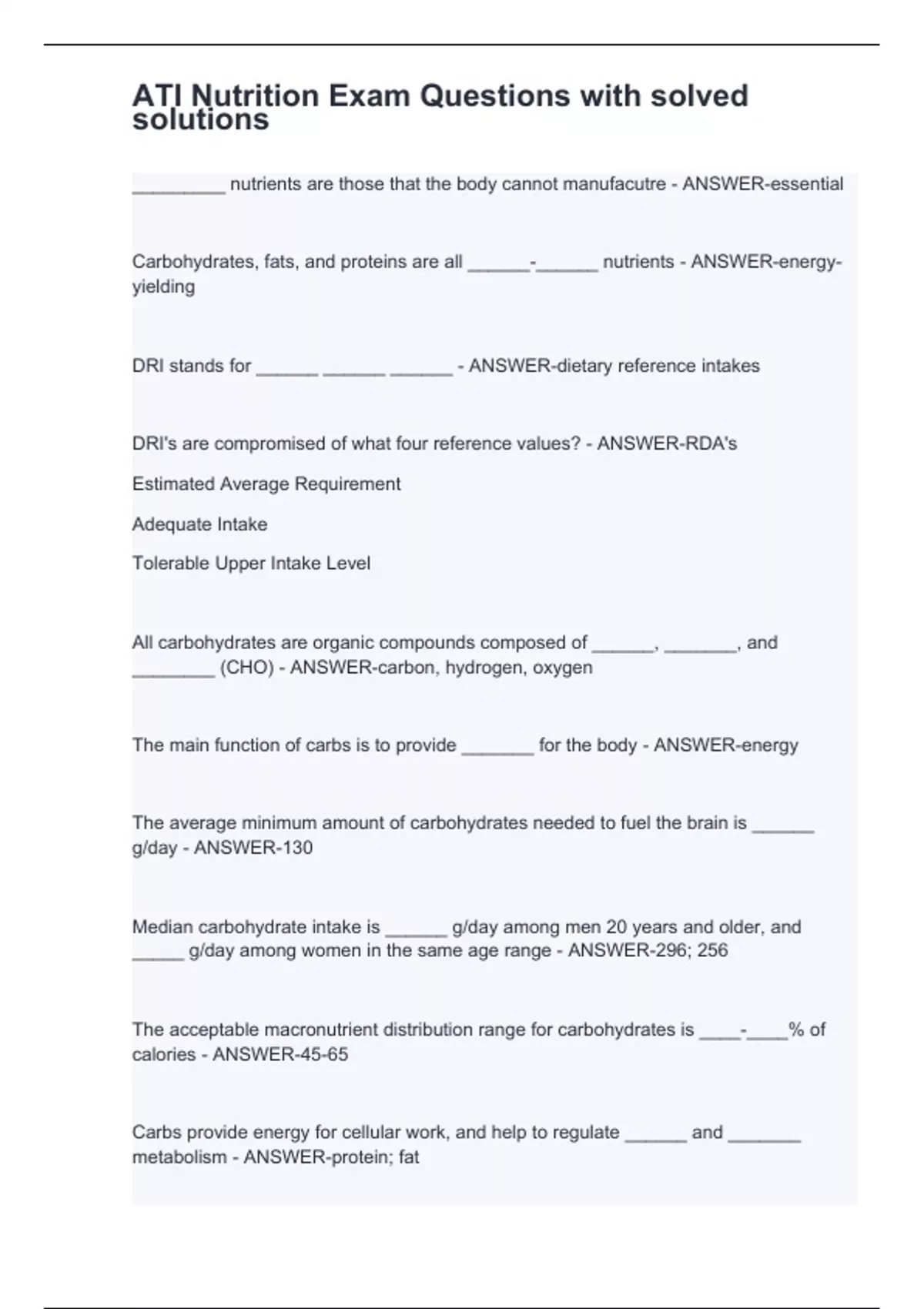 _________ nutrients are those that the body cannot manufacutre - ANSWER-essential Carbohydrates, fats, and proteins are all ______-______ nutrients - ANSWER-energy-yielding DRI stands for ______ ______ ______ - ANSWER-dietary reference intakes DRI's are compromised of what four reference values? - ANSWER-RDA's Estimated Average Requirement Adequate Intake Tolerable Upper Intake Level All carbohydrates are organic compounds composed of ______, _______, and ________ (CHO) - ANSWER-carbon, hydrogen, oxygen The main function of carbs is to provide _______ for the body - ANSWER-energy The average minimum amount of carbohydrates needed to fuel the brain is ______ g/day - ANSWER-130 Median carbohydrate intake is ______ g/day among men 20 years and older, and _____ g/day among women in the same age range - ANSWER-296; 256 The acceptable macronutrient distribution range for carbohydrates is ____-____% of calories - ANSWER-45-65 Carbs provide energy for cellular work, and help to regulate ______ and _______ metabolism - ANSWER-protein; fat