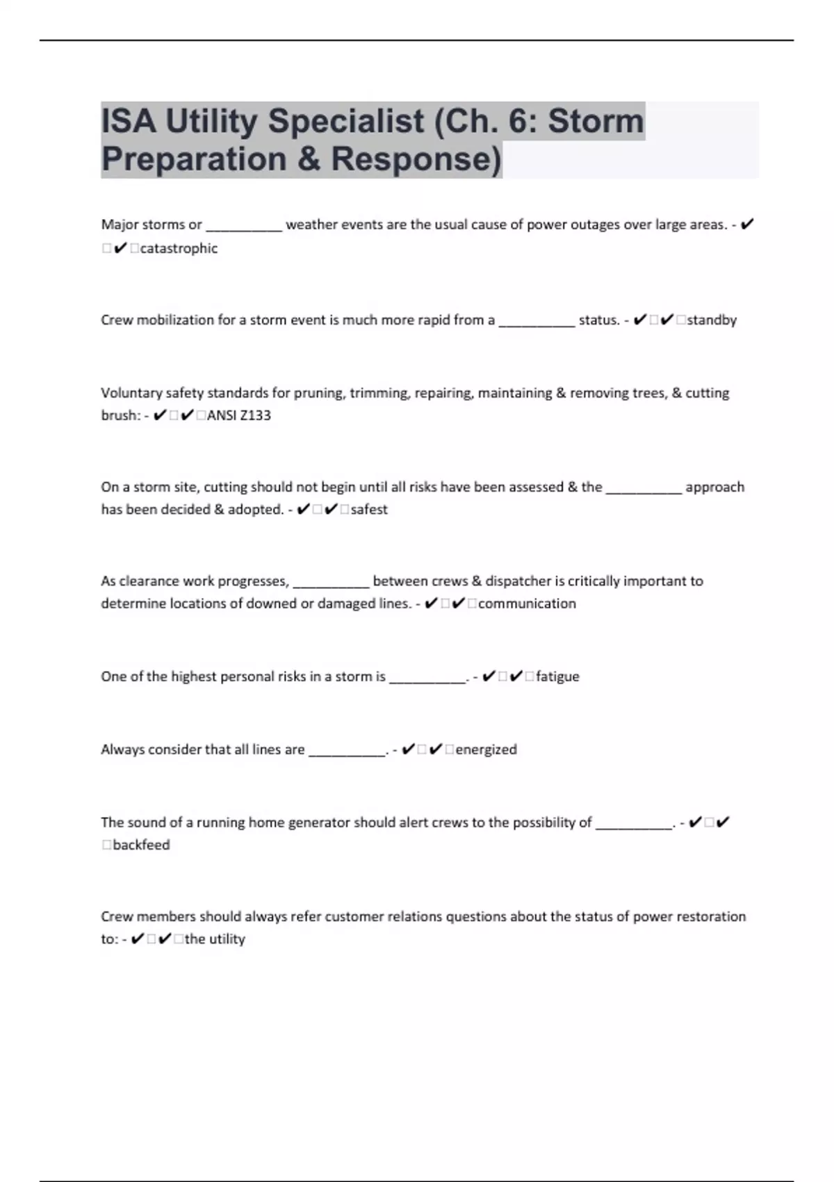 ISA Utility Specialist (Ch. 6: Storm Preparation & Response) 48 Questions with 100% Correct Answers | Verified | Updated 2024
