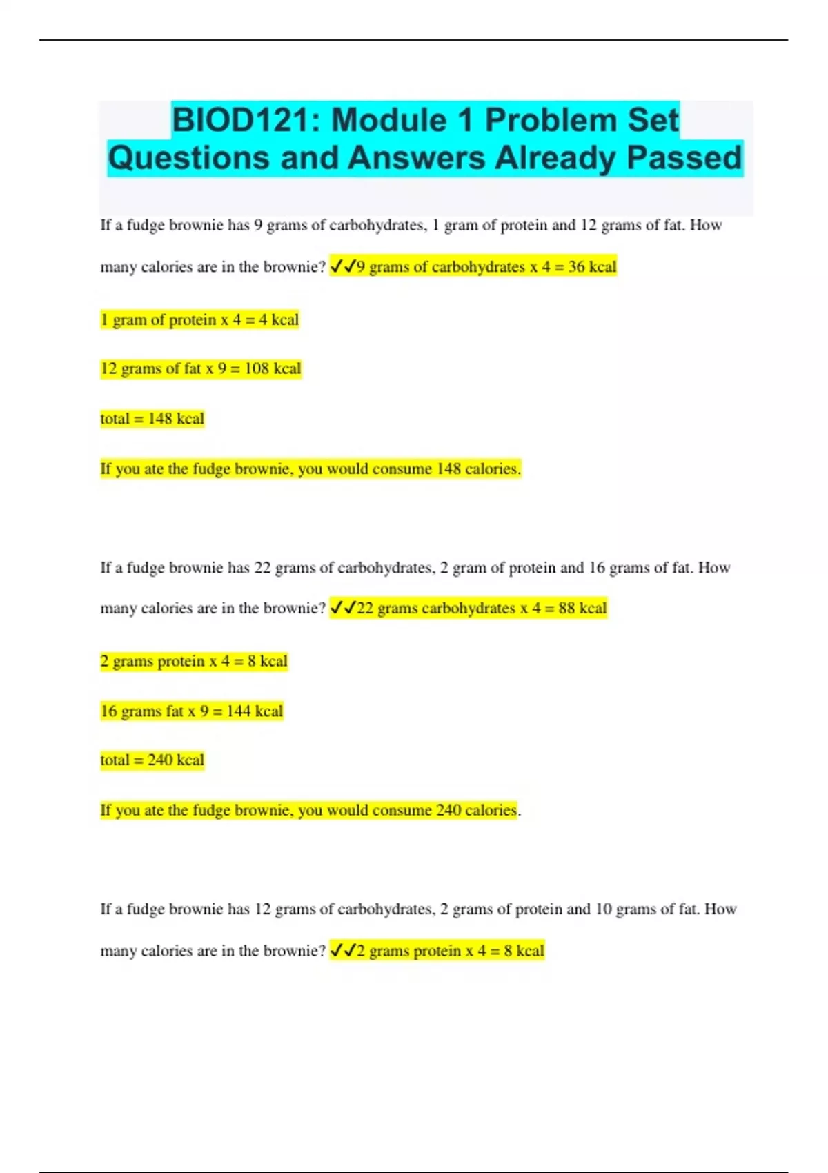 BIOD121: Module 1 Problem Set Questions and Answers Already Passed If a fudge brownie has 9 grams of carbohydrates, 1 gram of protein and 12 grams of fat. How many calories are in the brownie? 9 grams of carbohydrates x 4 = 36 kcal 1 gram of protein x 4 = 4 kcal 12 grams of fat x 9 = 108 kcal total = 148 kcal If you ate the fudge brownie, you would consume 148 calories. If a fudge brownie has 22 grams of carbohydrates, 2 gram of protein and 16 grams of fat. How many calories are in the brownie? 22 grams carbohydrates x 4 = 88 kcal 2 grams protein x 4 = 8 kcal 16 grams fat x 9 = 144 kcal total = 240 kcal If you ate the fudge brownie, you would consume 240 calories. If a fudge brownie has 12 grams of carbohydrates, 2 grams of protein and 10 grams of fat. How many calories are in the brownie? 2 grams protein x 4 = 8 kcal 10 grams fat x 9 = 90 kcal total = 146 kcal If you ate the fudge brownie, you would consume 146 calories. The current recommendation to maintain your body weight is 2000 calories daily. If you are told that you should not consume any more than 23 % of your calories from fat, how many grams of fat should you eat in a day? 2000 x .23 = 460460 calories / 9 = 51.1 grams of fat An individual's health can be assessed using the ABCDE's of nutritional assessment. Below, indicate what each letter represents. A - Athropometrics- measurements of body composition such as height and weight B - Biochemical- measurement of nutrients in blood, urine and feces C - Clinical - physical exam and general appearance D - Dietary- review of dietary intake and assessment E - Environmental- background, family history, life style and living conditions There are six classes of nutrients. Name three that are considered macronutrients. Carbohydrates, Protein, Lipids/Fats and Water There are six classes of nutrients. Name three that are organic. Carbohydrates, protein, fat and vitamins Name the key hormone that causes a feeling of hunger. Indicate where in the body it is produced and the process by which it operates. Ghrelin is produced by the stomach and travels to the brain to stimulate the hunger center as it deactivates the satiety center. There are six classes of nutrients. Name three that provide structure. Protein, fat, mineral and water The current recommendation to maintain your body weight is 2000 calories daily. If you are told that you should not consume any more than 61 % of your calories from protein, how many grams of protein should you eat in a day? 2000 x .61 = calories / 4 = 305 grams of protein Using the sample nutritional label below, how many calories are in a serving of this food? 31 grams carbs