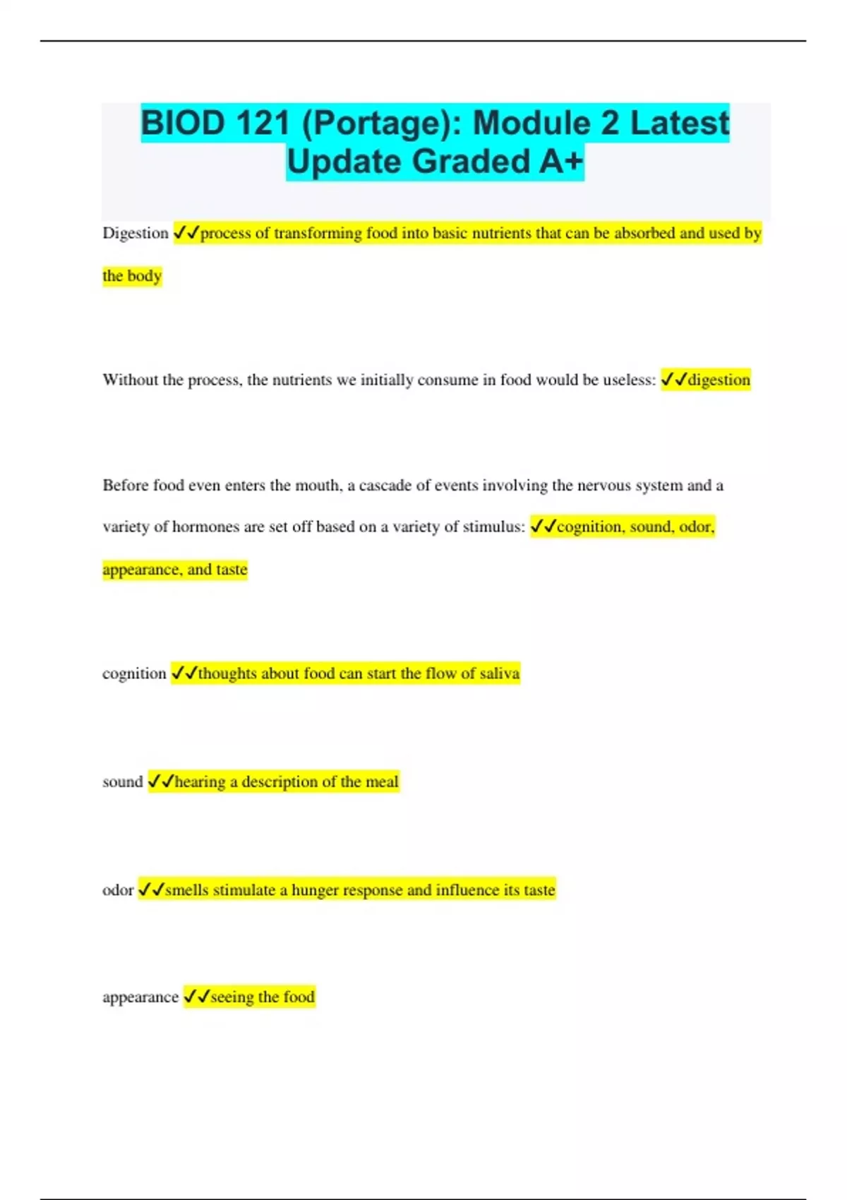 BIOD 121 (Portage): Module 2 Latest Update Graded A+ Digestion process of transforming food into basic nutrients that can be absorbed and used by the body Without the process, the nutrients we initially consume in food would be useless: digestion Before food even enters the mouth, a cascade of events involving the nervous system and a variety of hormones are set off based on a variety of stimulus: cognition, sound, odor, appearance, and taste cognition thoughts about food can start the flow of saliva sound hearing a description of the meal odor smells stimulate a hunger response and influence its taste appearance seeing the food taste begins as the food enters your mouth and also how it feels Once food enters the mouth it begins to break down into smaller units in both mechanical and chemical processes Mechanical process begins in the mouth with chewing peristalsis involuntary muscle contractions are used to move food mixtures along the tract Enzymes, acid, bile, and mucus chemical means the body has at its disposal to further aid in breaking down food enzymes proteins that catalyze (speed up) chemical reactions. They catalyze the chemical reactions required to break down food particles into smaller parts, which prepares the nutrients for absorption gastrointestinal (GI) tract a long hollow tube consisting of several layers of tissue that begins with the mouth and ends at the anus nutrient absorption occurs across the wall of the gastrointestinal (GI) tract mucosa (intestinal wall) is the inner-most layer, and it is made of absorption cells and glands circular and longitudinal muscles comprise the outer layers, both of which function to mix and move food along the GI tract Circular bands of muscle most often found where one part of the tract connects to another, serving as valves to control the flow of the food particles 3 processes the body can use to move nutrients from the GI tract into the blood/lymph system and eventually into the cells: Passive diffusion, Facilitated diffusion, and Active transport Passive diffusion substances move easily in and out of cells without the use of energy. Nutrients move from high to low concentration. Facilitated Diffusion no energy is required, but a special protein carrier is required to help substances cross in or out of the cell. Nutrients move from high to low concentration. 2 processes that move from high to low concentrations and require no energy passive and facilitated diffusion Active transport energy is required to move substances in or out of the cell. Nurtients move from low to high concentrations Moves nutrients against the natural gradient: active transport Does not require a special protein carrier/transport molecules: passive transport GI tract can be divided into six main parts: 1) mouth 2) esophagus 3) stomach 4) small intestine 5) large intestine 6) rectum