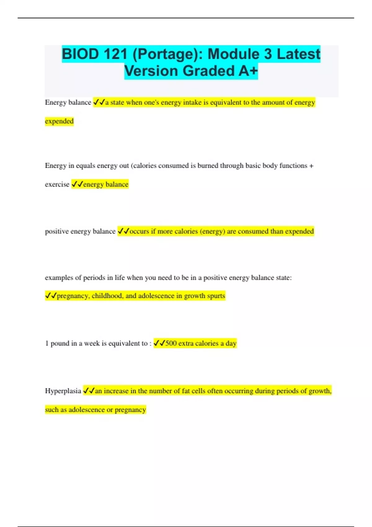 BIOD 121 (Portage): Module 3 Latest Version Graded A+ Energy balance a state when one's energy intake is equivalent to the amount of energy expended Energy in equals energy out (calories consumed is burned through basic body functions + exercise energy balance positive energy balance occurs if more calories (energy) are consumed than expended examples of periods in life when you need to be in a positive energy balance state: pregnancy, childhood, and adolescence in growth spurts 1 pound in a week is equivalent to : 500 extra calories a day Hyperplasia an increase in the number of fat cells often occurring during periods of growth, such as adolescence or pregnancy Hypertrophy an increase in the size of fat cells, most often seen in periods of low growth and maintenance, such as throughout adulthood Negative energy balance occurs if fewer calories are consumed than calories expended Examples of negative energy balance situations: during illness or trauma, major burn injury, intentional act such as dieting to meet a weight loss goal Our sole source of energy intake is from: food and beverages Energy can be expended naturally via _____________ , _____________, and _________________ basal metabolism, the thermic effect of food, and thermogenesis Energy can be expended intentionally through _______________ physical activity (aka exercise) Two major components of energy expenditure are: basal metabolic rate and physical activity Basal metabolic rate (BMR) the number of calories used by the body while in a fasting state and accounts for approximately 60-70% of energy expenditure BMR varies by person based on factors such as: gender, lean body mass, body size, temperature, age, nervous system activities, levels of caffeine intake, and tobacco use BMR males: 1 kcal/kg/hour BMR females: 0.9 kcal/kg/hour As we age BMR declines by ______________% per decade so we must adjust eating habits to prevent weight gain. 1-2 % Thermic effect of food (TEF) the energy used for digestion and absorption of food and accounts for approximately 10% of the calories expended. larger meals higher in protein result in a higher ________ thermic effect of food (TEF) Thermogenesis the ability to regulate temperature and activities such as fidgeting, maintaining body posture, and shivering. ( energy burned through this process is very small) Physical activity accounts for 15-40% of our energy expenditure Physical activity factors include: body size, fitness level, and actual activity to determine how many calories are expended The amount of energy used can be measured both ________________ and ___________________. directly and indirectly Direct calorimetry measures the amount of heat given off the body. An insulated chamber surrounded by a thin layer of water is used to measure the amount of heat emitted by the subject in the chamber. (used infrequently due to complexity and expense) Direct calorimetry Indirect calorimetry uses oxygen intake