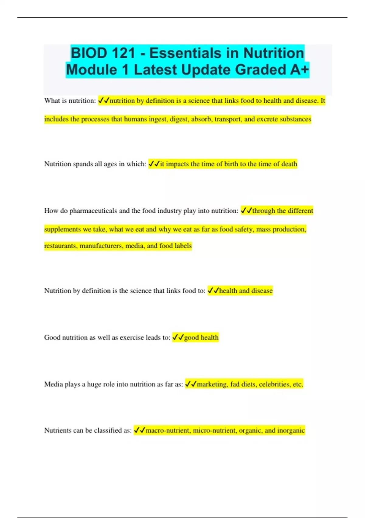 BIOD 121 - Essentials in Nutrition Module 1 Latest Update Graded A+