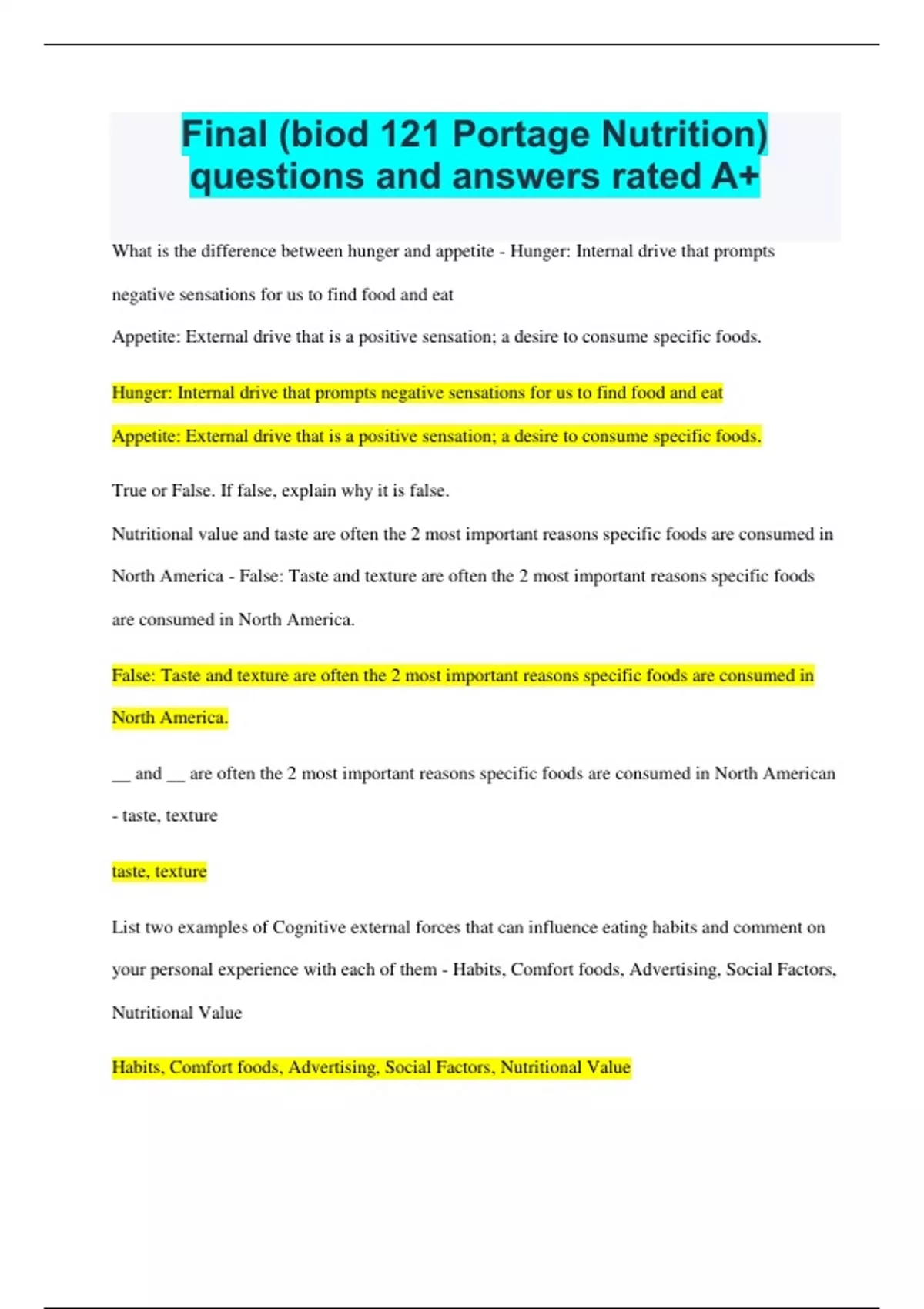 Final (biod 121 Portage Nutrition) questions and answers rated A+ What is the difference between hunger and appetite - Hunger: Internal drive that prompts negative sensations for us to find food and eat Appetite: External drive that is a positive sensation; a desire to consume specific foods. Hunger: Internal drive that prompts negative sensations for us to find food and eat Appetite: External drive that is a positive sensation; a desire to consume specific foods. True or False. If false, explain why it is false. Nutritional value and taste are often the 2 most important reasons specific foods are consumed in North America - False: Taste and texture are often the 2 most important reasons specific foods are consumed in North America. False: Taste and texture are often the 2 most important reasons specific foods are consumed in North America. __ and __ are often the 2 most important reasons specific foods are consumed in North American - taste, texture taste, texture List two examples of Cognitive external forces that can influence eating habits and comment on your personal experience with each of them - Habits, Comfort foods, Advertising, Social Factors, Nutritional Value Habits, Comfort foods, Advertising, Social Factors, Nutritional Value 1. ______________is the internal drive to find and eat food. Often experienced as a 2. ______________ sensation. - hunger, negative 1. Hunger 2. negative Vitamins are considered both: a. Macronutrients and Inorganic b. Macronutrients and Organic c. Micronutrients and Organic d. Micronutrients and Inorganic b. Macronutrients and Organic Define macronutrients - nutrients needed in large amounts in the body nutrients needed in large amounts in the body Protein is considered both - A. Micronutrients and Inorganic B. Macronutrients and Inorganic C. Micronutrients and Organic D. Macronutrients and Organic D. Macronutrients and Organic Define inorganic - any substance that does not contain carbon any substance that does not contain carbon Nutrition is the science that links foods to _____ and ______ - 1. weight; health 2. nutritional value; disease 3. weight; disease 4. health; nutritional value 5. health; disease 5. health; disease True or false: Nutrition is the science that links foods to health disease - True True Explain the difference between Internal and External drives that influence our desire to eat - The internal drive is hunger and is associated with negative sensations like churning, growling and pain in the stomach. External drives have to do with appetite and are associated with positive food sensations and lead us to eat when we are not hungry. The internal drive is hunger and is associated with negative sensations like churning, growling and pain in the stomach. External drives have to do with appetite and are associated with positive food sensations and lead us to eat when we are not hungry. Describe hunger and appetite, including their associated drives and sensations in the answer - Hunger is an internal drive associated with churning, growling, or pain in the stomach. Appetite is an external drive associated with pleasant food sensations and leads us to eat when not hungry Hunger is an internal drive associated with churning, growling, or pain in the stomach. Appetite is an external drive associated with pleasant food sensations and leads us to eat when not hungry List 3 hormones associated with satiety. Explain how at least 1 works to decrease hunger -Leptin -alerts the brain to turn off the hunger center and activates the satiety center when consuming a meal. Serotonin - affects motility and communicates with the brain for satiety. Cholecystokinin (CCK) - slows down stomach emptying to give a feeling of fullness (also increases bile production and release from gallbladder). Leptin -alerts the brain to turn off the hunger center and activates the satiety center when consuming a meal. Serotonin - affects motility and communicates with the brain for satiety. Cholecystokinin (CCK) - slows down stomach emptying to give a feeling of fullness (also increases bile production and release from gallbladder). A pharmaceutical company is interested in designing a drug to combat obesity. First, list 2 hormones involved in the regulation of hunger and satiety and state their function. Then, explain why the pharmaceutical would target these to treat obesity - Leptin alerts the brain to turn off the hunger center and activates the satiety center when consuming a meal. By sensitizing the patient to leptin or triggering it's activity in the brain, the patient would feel fuller and eat less. Ghrelin stimulates the hunger center as it deactivates the satiety center. The drug company could block ghrelin and decrease the feeling of hunger so the patient's eat less. Leptin alerts the brain to turn off the hunger center and activates the satiety center when consuming a meal. By sensitizing the patient to leptin or triggering it's activity in the brain, the patient would feel fuller and eat less. Ghrelin stimulates the hunger center as it deactivates the satiety center. The drug company could block ghrelin and decrease the feeling of hunger so the patient's eat less. the hormone that alerts the brain to turn off the hunger center and activates the satiety center when consuming a meal. - Leptin Leptin the hormone that affects motility and communicates with the brain for satiety - Serotonin Serotonin The hormone that slows down stomach emptying to give a feeling of fullness (also increases bile production and release from the gallbladder). - Cholecystokinin (CCK) Cholecystokinin (CCK) A _________ is a substance that can promote growth and development, maintain tissues and cells, fuel the body for physical and metabolic work, or regulate a body process. - nutrient nutrient Which type of molecule is defined as a substance that does not contain carbon 1. Macronutrient 2. Organic 3. Inorganic 4. Micronutrient 3. Inorganic