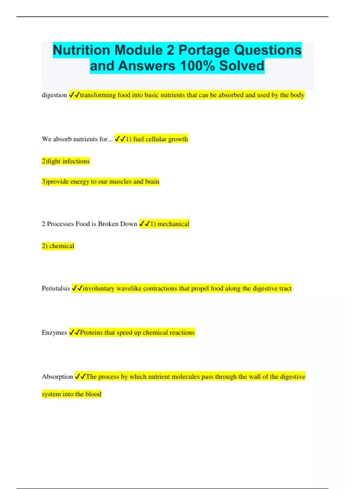 Nutrition Module 2 Portage Questions and Answers 100% Solved digestion transforming food into basic nutrients that can be absorbed and used by the body We absorb nutrients for... 1) fuel cellular growth 2)fight infections 3)provide energy to our muscles and brain 2 Processes Food is Broken Down 1) mechanical 2) chemical Peristalsis involuntary wavelike contractions that propel food along the digestive tract Enzymes Proteins that speed up chemical reactions Absorption The process by which nutrient molecules pass through the wall of the digestive system into the blood Mucosa The innermost layer of the human digestive tract; made of absorptive cells and glands passive diffusion substances move easily in and out of cells without energy, high to low concentrations facilitated diffusion No energy required, BUT special protein carrier is needed to help substances cross in and out of the cell, high to low concentrations active transport Energy-requiring process that moves material across a cell membrane against a concentration difference, low to high 6 parts of the GI tract 1) Mouth 2) Esophagus 3) Stomach 4) Small Intestine 5) Large intestine 6) Rectum Mouth Enzymes salivary amylase: starches lingual lipase: fats Epiglottis flap that covers the trachea sphincter muscle circular muscle controls how much is allowed to pass stomach capacity 4 cups, 2-3 hours Stomach Chemicals 1) pepsin (enzyme)- protein digestion 2) gastric lipase (enzyme)- fat digestion 3) Gastrin (hormone)- controls acid production 4) Chyme- food particles combine with enzymes intrinsic factor makes the absorption of vitamin B12 happen in stomach small intestine function digestion and absorption large intestine function Reabsorbs water and stores and eliminates undigested food, waste management pyloric sphincter Controls passage of food from stomach to small intestine 3 small intestine parts duodenum, jejunum, ileum Ileacecal sphincter Between small and large intestine, prevents contents of the large intestine from entering the small intestine Organs associated with small intestine liver, gallbladder, pancreas liver secretes bile to break down fats