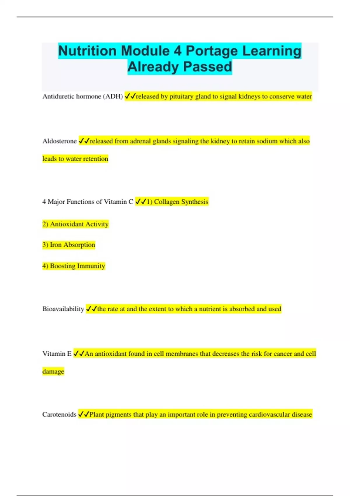 Nutrition Module 4 Portage Learning Already Passed Antiduretic hormone (ADH) released by pituitary gland to signal kidneys to conserve water Aldosterone released from adrenal glands signaling the kidney to retain sodium which also leads to water retention 4 Major Functions of Vitamin C 1) Collagen Synthesis 2) Antioxidant Activity 3) Iron Absorption 4) Boosting Immunity Bioavailability the rate at and the extent to which a nutrient is absorbed and used Vitamin E An antioxidant found in cell membranes that decreases the risk for cancer and cell damage Carotenoids Plant pigments that play an important role in preventing cardiovascular disease Major Minerals more than 100mg/daily Minor Minerals less than 100mg/daily Vitamin A Night blindness is an early sign of a deficiency of this vitamin Iron (2 types) Heme-animal flesh, hemoglobin or myoglobin nonheme- elemental 6 Ions for Water Balance 1) Sodium 2) Potassium 3) Chloride 4) Phosphate 5) Magnesium 6) Calcium Extracellular water outside the cell Folate Very important in pregnant women, deficiency can result in neural tube defects 8 B vitamins 1) thiamin 2) riboflavin 3) niacin 4) panthothenic acid 5) biotin 6) B-6 7) Folate 8) B-12 Absorbing more Iron combine with heme iron or Vitamin C Osmosis when water moves from inside the cell to outside the cell intracellular within the cell Vitamin D Can be produced by the body Sodium a. fluid balance/nerve impulse transmision b. table salt, processed foods, restaurants c. OVER consumption=hypertension Potassium a. intracellular fluid control, nerve impulse transmission, muscle contractions b. fruits, vegetables, whole grains, low-fat dairy c. muscle cramps, confusion, cardiac arrythimias Chloride a. ectracellular fluid control, immune, hydrochloric acid in stomach b. table salt c. OVER consumption=high blood pressure Calcium a. teeth/bone structure, blood clotting, nerve impulse, muscle contractions b. dairy, dark leafy greens, tofu, salmon c. tetany muscles can't relax Phosphorus a. bone health b. meat, cheese, milk, grains c. N/A Magnesium a. bone health, production