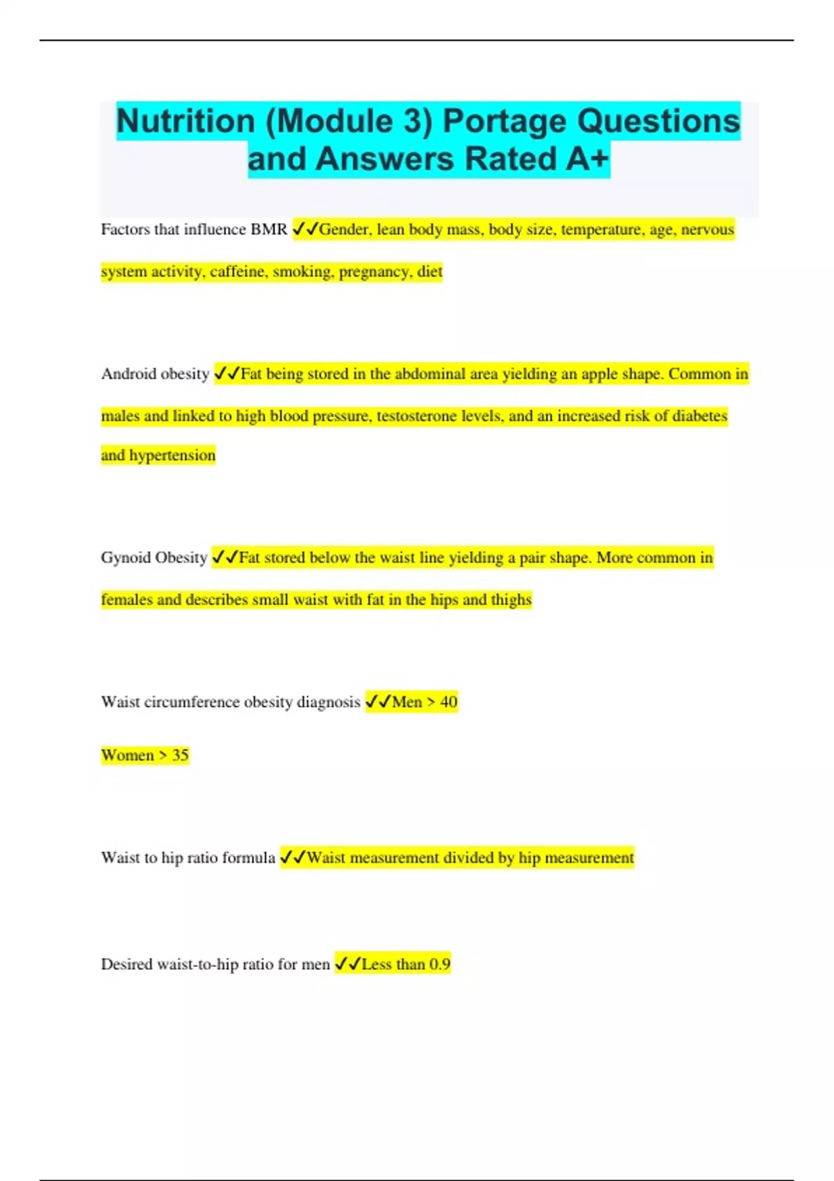 Nutrition (Module 3) Portage Questions and Answers Rated A+ Factors that influence BMR Gender, lean body mass, body size, temperature, age, nervous system activity, caffeine, smoking, pregnancy, diet Android obesity Fat being stored in the abdominal area yielding an apple shape. Common in males and linked to high blood pressure, testosterone levels, and an increased risk of diabetes and hypertension Gynoid Obesity Fat stored below the waist line yielding a pair shape. More common in females and describes small waist with fat in the hips and thighs Waist circumference obesity diagnosis Men > 40 Women > 35 Waist to hip ratio formula Waist measurement divided by hip measurement Desired waist-to-hip ratio for men Less than 0.9 Exceeding would be indicative of a health risk Desired waist to hip ratio for a woman Less than 0.8 Exceeding would be indicative of a health risk Healthy BMI range 18.5 to 25 Body fat content measures Underwater weighing, electrical resistance (bioelectrical impedance), anthropometric's (calipers), Dual energy x-ray (DEXA) Obese BMI over 30 Indirect Calorimetry Uses O2 intake and CO2 output along with scientific formulas to measure energy expended. Convenient and easy and portable Direct Calorimetry Measures the amount of heat given off by the body. And insulated chamber surrounded by a thin layer of water is used to measure the amount of heat admit it by the subject in the chamber. Used infrequently Minimum calorie consumption Female: No less than 1200 Male: No less than 1500 Body shape with the greatest health risk Apple shape has the greatest health risk because fat in the abdominal tissues interfere with the livers ability to use insulin BMR calculation for men 66 + (6.23 x lbs) / (12.7 x inch) - (6.8 x age) BMR calculation for women 66 + (4.35 x lbs) / (4.7 x inch) - (4.7 x age) Behavior modification strategies Chain breaking, stimulus control, cognitive restructuring, contingency management, self monitoring Chain breaking Breaking the tie that connects two or more behaviors that encourage over eating Stimulus control Finding ways to avoid temptation went hungry or bored. Cognitive restructuring Changing your frame of mind regarding food. Rather than turning to food when you are stressed decide to exercise instead. Contingency management Preparing for situations that might trigger over eating. (Party, office donuts, Etc.) self-monitoring Keep a diary to record what you eat, when you eat it, how you felt, and where you were when you ate it. Helps to reveal patterns that may be negatively affect your weight loss efforts Physical activity estimates 1.2 = little to no exercise 1.375 = light exercise 1 to 3 days per week 1.55 = moderate exercise 3 to 5 days per week 1.725 = hard exercise 6 to 7 days per week 1.9 = hard daily exercise/job Components of healthy weight loss and weight maintenance Calorie control, exercise and behavior modification Energy balance A state when one's energy intake is equivalent to the amount of energy expended Positive energy balance Occurs if more calories/energy are consumed than expended. Needed in pregnancy or growth spurts Hyperplasia Increase in the number of fat cells often occurring during periods of growth Hypertrophy An increase in the size of fat cells most often seen in periods of low growth and maintenance Negative energy balance Occurs if fewer calories are consumed than calories expended. BMI chart exceptions Children, teens, pregnant women, breast-feeding woman, short stature adults, very muscular individuals and the elderly Drastic weight loss measures Medication, extremely low calorie diet's, and/or surgery Medications for weight loss Amphetamines,