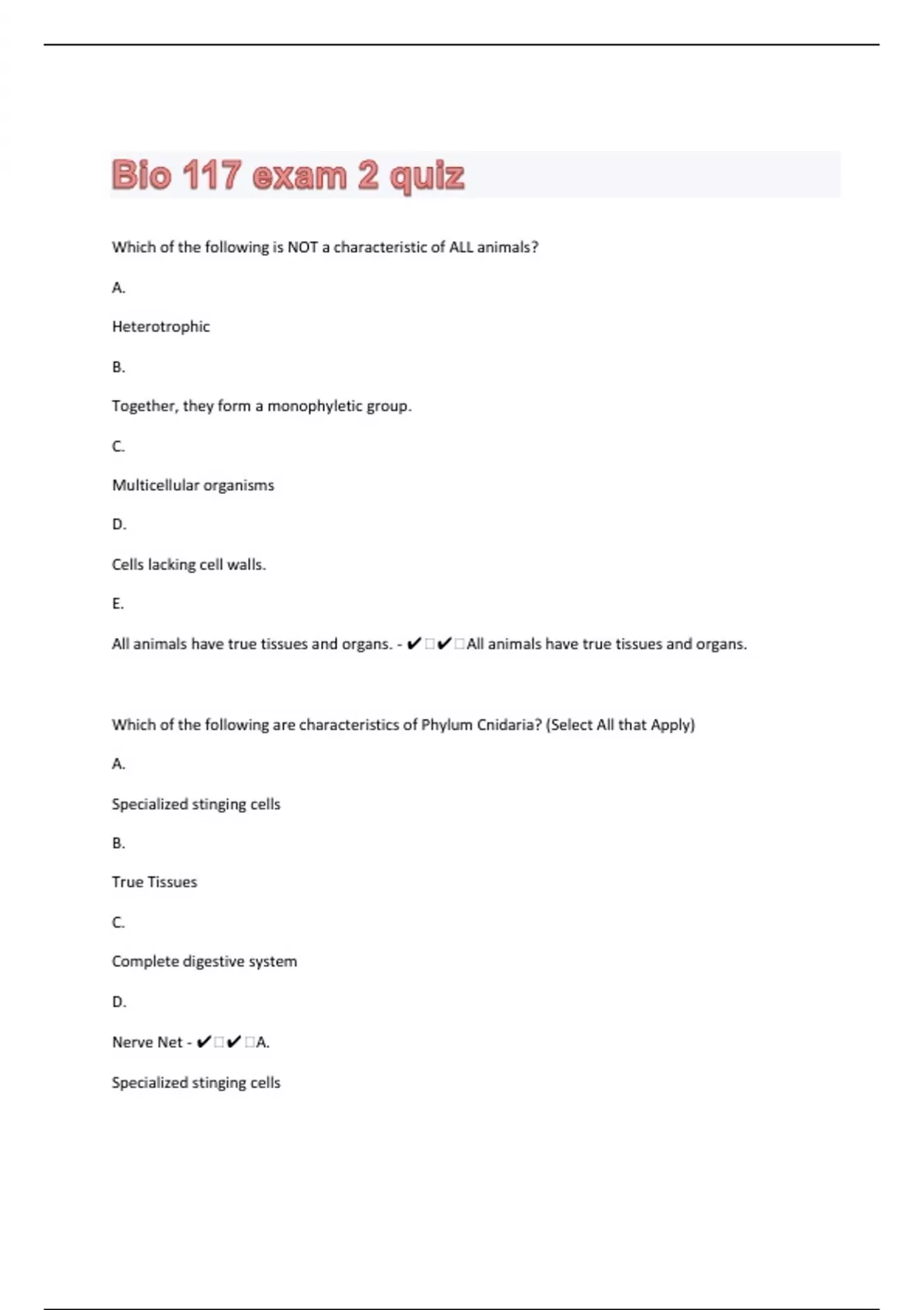 Which of the following is NOT a characteristic of ALL animals? A. Heterotrophic B. Together, they form a monophyletic group. C. Multicellular organisms D. Cells lacking cell walls. E. All animals have true tissues and organs. - ️️All animals have true tissues and organs. Which of the following are characteristics of Phylum Cnidaria? (Select All that Apply) A. Specialized stinging cells B. True Tissues C. Complete digestive system D. Nerve Net - ️️A. Specialized stinging cells
