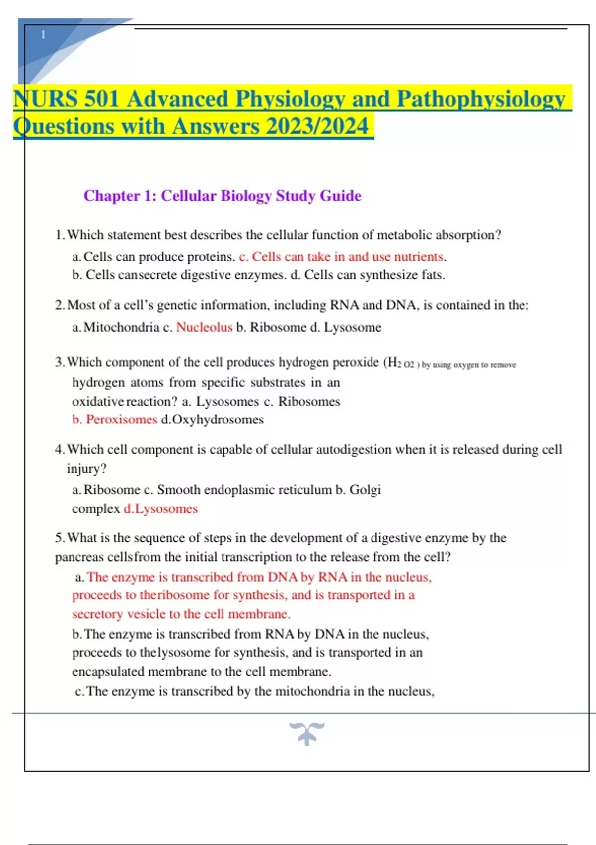 NURS 501 Advanced Physiology and Pathophysiology Questions with Answers 2023/2024