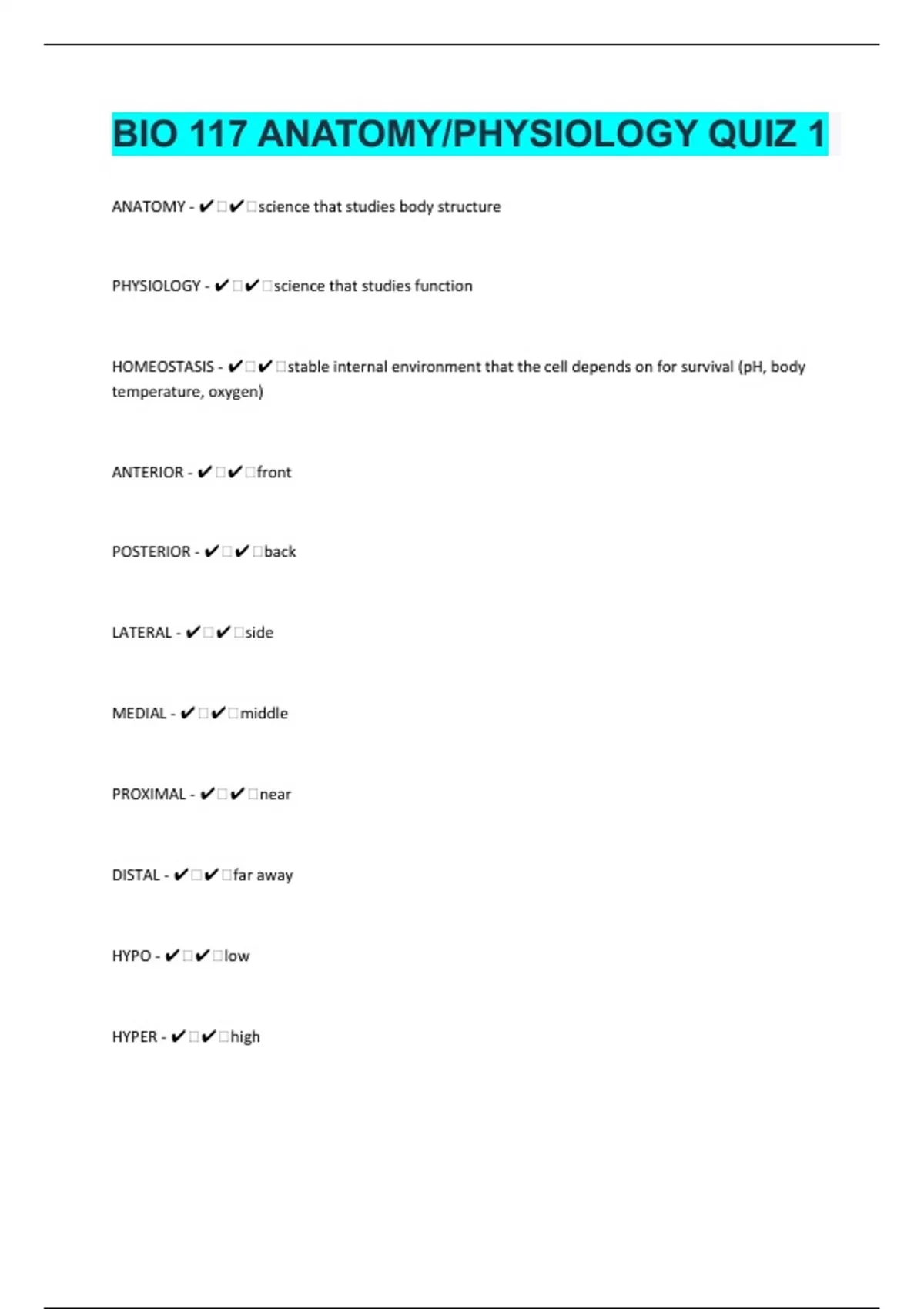 ANATOMY - ️️science that studies body structure PHYSIOLOGY - ️️science that studies function HOMEOSTASIS - ️️stable internal environment that the cell depends on for survival (pH, body temperature, oxygen) ANTERIOR - ️️front POSTERIOR - ️️back LATERAL - ️️side MEDIAL - ️️middle PROXIMAL - ️️near DISTAL - ️️far away HYPO - ️️low HYPER - ️️high