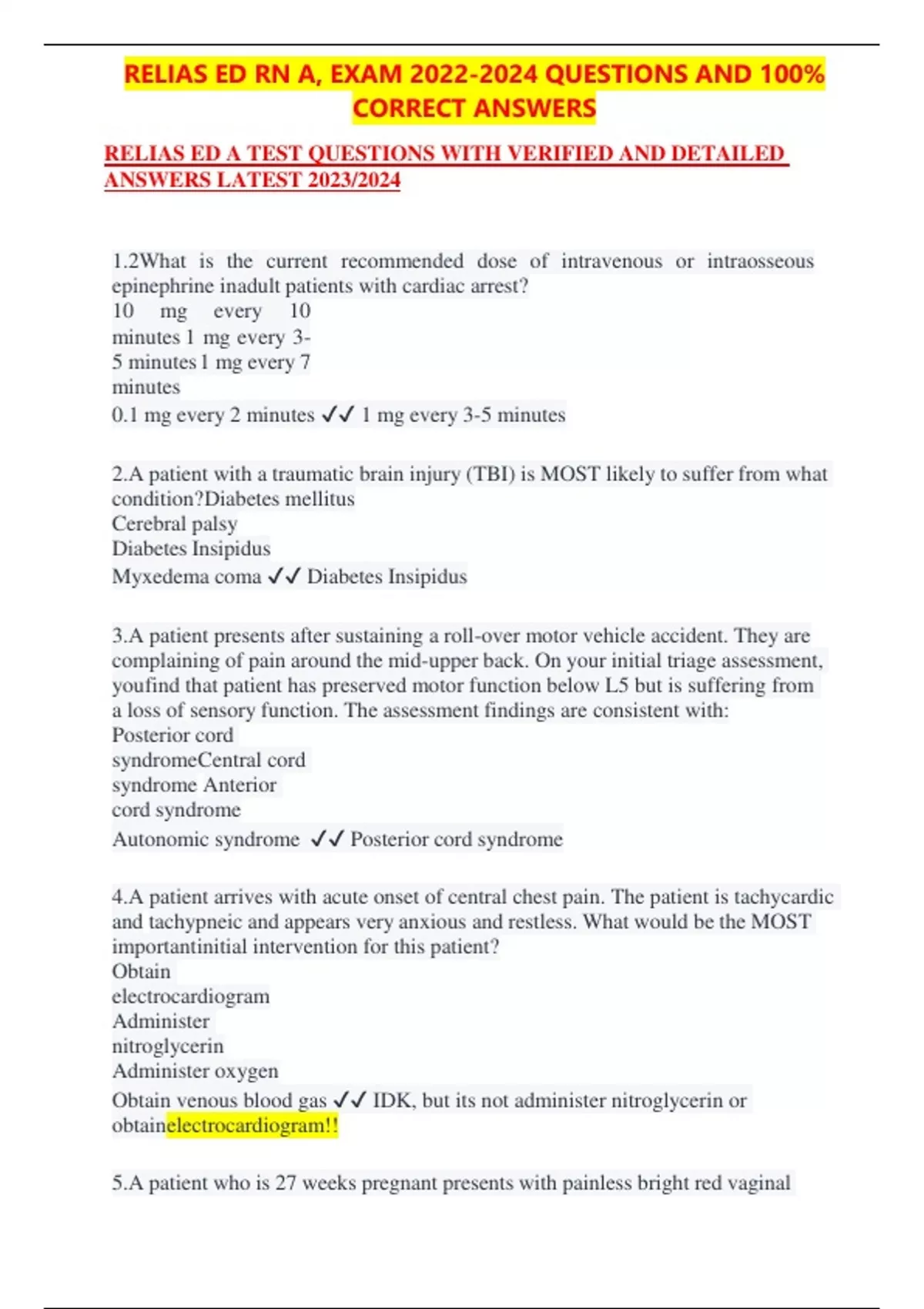 RELIAS ED RN A, EXAM QUESTIONS AND 100% CORRECT ANSWERS RELIAS ED A TEST QUESTIONS WITH VERIFIED AND DETAILED ANSWERS LATEST 2023/2024 1.2What is the current recommended dose of intravenous or intraosseous epinephrine in adult patients with cardiac arrest? 10 mg every 10 minutes 1 mg every 3- 5 minutes 1 mg every 7 minutes 0.1 mg every 2 minutes 1 mg every 3-5 minutes 2.A patient with a traumatic brain injury (TBI) is MOST likely to suffer from what condition? Diabetes mellitus Cerebral palsy Diabetes Insipidus Myxedema coma Diabetes Insipidus 3.A patient presents after sustaining a roll-over motor vehicle accident. They are complaining of pain around the mid-upper back. On your initial triage assessment, you find that patient has preserved motor function below L5 but is suffering from a loss of sensory function. The assessment findings are consistent with: Posterior cord syndrome Central cord syndrome Anterior cord syndrome Autonomic syndrome Posterior cord syndrome 4.A patient arrives with acute onset of central chest pain. The patient is tachycardic and tachypneic and appears very anxious and restless. What would be the MOST important initial intervention for this patient? Obtain RELIAS ED RN A, EXAM QUESTIONS AND 100% CORRECT ANSWERS bleeding. What condition correlates with the presenting symptoms? Abruptio placenta Placenta Previa Ectopic pregnancy Premature rupture of membranes (PROM) Placenta Previa 6.What is a common assessment finding in a patient with a tension pneumothorax? Petechial chest rash Distended neck veins Equal chest wall expansion RELIAS ED RN A, EXAM QUESTIONS AND 100% CORRECT ANSWERS 7.Flattened neck veins Distended Neck Veins A patient presents with a two-day history of fever, cough, mild shortness of breath (SOB), sore throat, myalgia, and new onset of loss of taste and smell. What is the patient MOST likely suffering from? Giardia Microsporid ia COVID 19 Tuberculosis COVID 19 8.The deficiency of anti-diuretic hormone (ADH) can lead to what endocrine disorders? Diabetes Insipidus Diabetes Mellitus Adrenal Insufficiency Syndrome of inappropriate secretion of ADH (SIADH) Diabetes Insipidus 9.A patient presents after an intentional overdose of propranolol approximately 2 hours ago. The patient has severe hypotension and bradycardia. IV fluids and vasopressors are initiated. What nursing assessment findings indicate the treatment has been effective? Tension Pneumothorax Tension Pneumothorax Which of the following represent categories utilized to triage patients during a mass RELIAS ED RN A, EXAM QUESTIONS AND 100% CORRECT ANSWERS yellow Green, yellow, red, black Green, yellow, red, black A 22-year old female who is 8 weeks pregnant presents with a sudden onset of left lower abdominal pain and vaginal bleeding. The patient's family member stated that she had a syncopal episode shortly after that. What is the MOST likely diagnosis for her? Ruptured appendix Placenta previa
