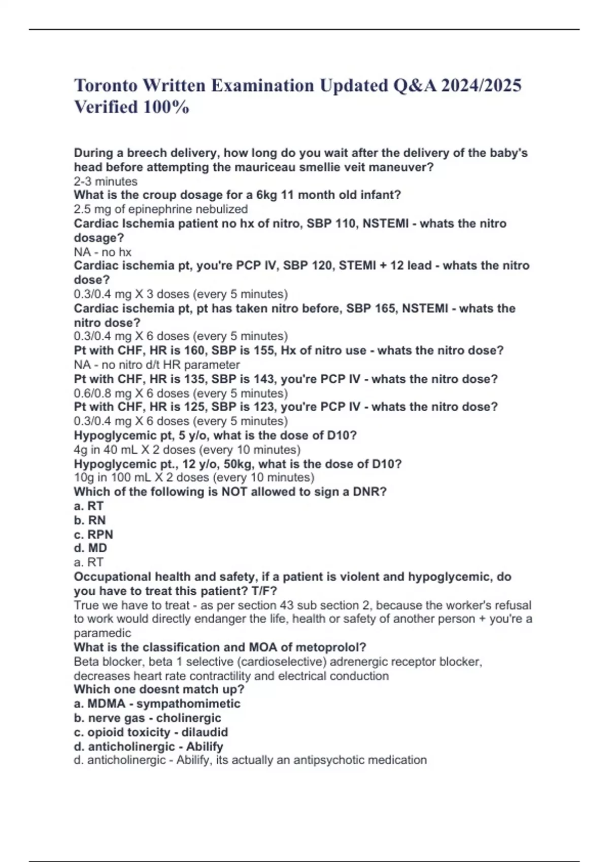 Toronto Written Examination Updated Q&A 2024/2025 Verified 100% During a breech delivery, how long do you wait after the delivery of the baby's head before attempting the mauriceau smellie veit maneuver? 2-3 minutes What is the croup dosage for a 6kg 11 month old infant? 2.5 mg of epinephrine nebulized Cardiac Ischemia patient no hx of nitro, SBP 110, NSTEMI - whats the nitro dosage? NA - no hx Cardiac ischemia pt, you're PCP IV, SBP 120, STEMI + 12 lead - whats the nitro dose? 0.3/0.4 mg X 3 doses (every 5 minutes) Cardiac ischemia pt, pt has taken nitro before, SBP 165, NSTEMI - whats the nitro dose? 0.3/0.4 mg X 6 doses (every 5 minutes) Pt with CHF, HR is 160, SBP is 155, Hx of nitro use - whats the nitro dose? NA - no nitro d/t HR parameter Pt with CHF, HR is 135, SBP is 143, you're PCP IV - whats the nitro dose? 0.6/0.8 mg X 6 doses (every 5 minutes) Pt with CHF, HR is 125, SBP is 123, you're PCP IV - whats the nitro dose? 0.3/0.4 mg X 6 doses (every 5 minutes) Hypoglycemic pt, 5 y/o, what is the dose of D10? 4g in 40 mL X 2 doses (every 10 minutes) Hypoglycemic pt., 12 y/o, 50kg, what is the dose of D10? 10g in 100 mL X 2 doses (every 10 minutes) Which of the following is NOT allowed to sign a DNR? a. RT b. RN c. RPN d. MD a. RT Occupational health and safety, if a patient is violent and hypoglycemic, do you have to treat this patient? T/F? True we have to treat - as per section 43 sub section 2, because the worker's refusal to work would directly endanger the life, health or safety of another person + you're a paramedic What is the classification and MOA of metoprolol? Beta blocker, beta 1 selective (cardioselective) adrenergic receptor blocker, decreases heart rate contractility and electrical conduction Which one doesnt match up? a. MDMA - sympathomimetic b. nerve gas - cholinergic c. opioid toxicity - dilaudid d. anticholinergic - Abilify d. anticholinergic - Abilify, its actually an antipsychotic medication