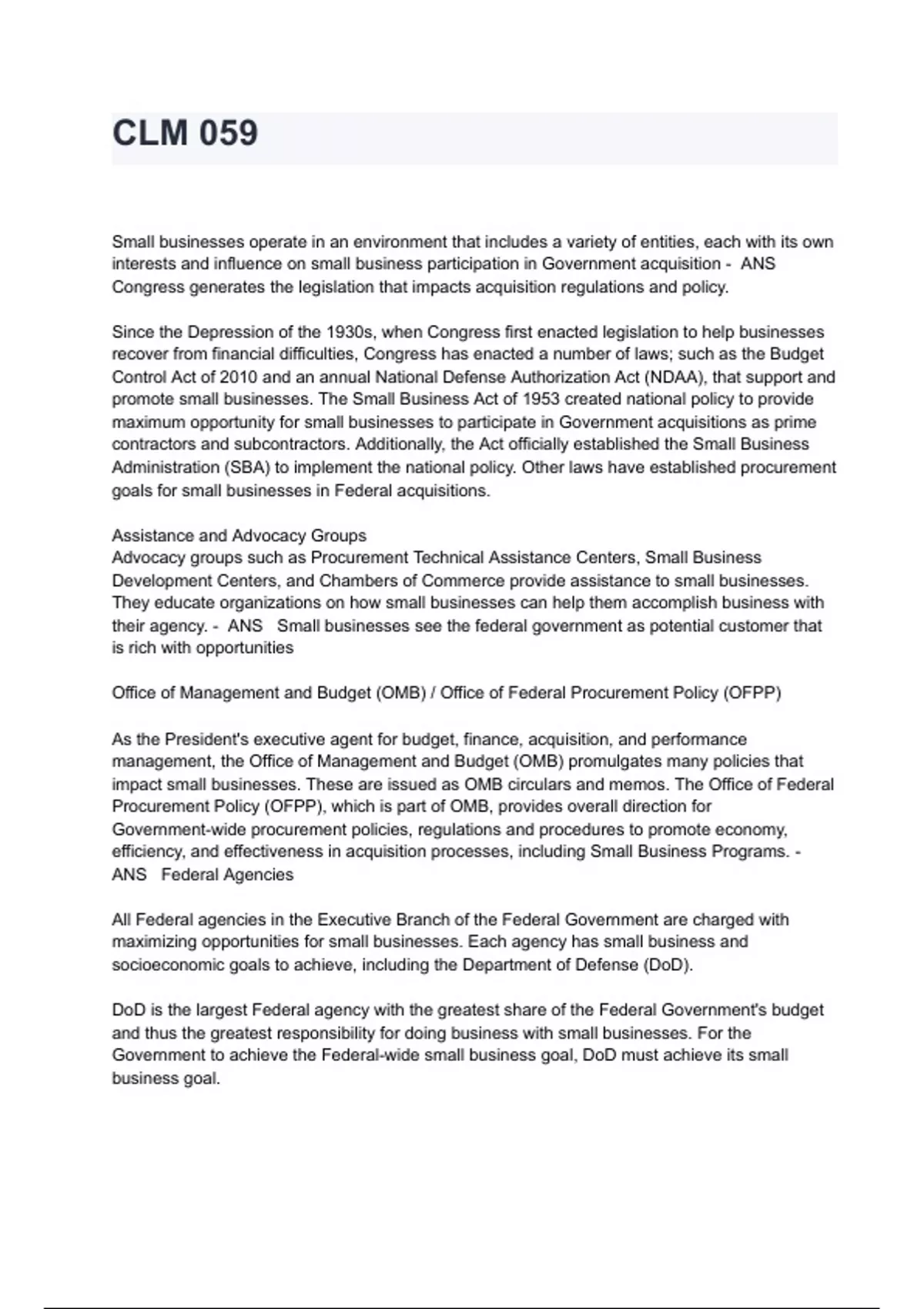 CLM 059 Exam Questions With Correct Verified Solutions Small businesses operate in an environment that includes a variety of entities, each with its own interests and influence on small business participation in Government acquisition - ANS Congress generates the legislation that impacts acquisition regulations and policy. Since the Depression of the 1930s, when Congress first enacted legislation to help businesses recover from financial difficulties, Congress has enacted a number of laws; such as the Budget Control Act of 2010 and an annual National Defense Authorization Act (NDAA), that support and promote small businesses. The Small Business Act of 1953 created national policy to provide maximum opportunity for small businesses to participate in Government acquisitions as prime contractors and subcontractors. Additionally, the Act officially established the Small Business Administration (SBA) to implement the national policy. Other laws have established procurement goals for small businesses in Federal acquisitions. Assistance and Advocacy Groups Advocacy groups such as Procurement Technical Assistance Centers, Small Business Development Centers, and Chambers of Commerce provide assistance to small businesses. They educate organizations on how small businesses can help them accomplish business with their agency. - ANS Small businesses see the federal government as potential customer that is rich with opportunities Office of Management and Budget (OMB) / Office of Federal Procurement Policy (OFPP) As the President's executive agent for budget, finance, acquisition, and performance management, the Office of Management and Budget (OMB) promulgates many policies that impact small businesses. These are issued as OMB circulars and memos. The Office of Federal Procurement Policy (OFPP), which is part of OMB, provides overall direction for Government-wide procurement policies, regulations and procedures to promote economy, efficiency, and effectiveness in acquisition processes, including Small Business Programs. - ANS Federal Agencies All Federal agencies in the Executive Branch of the Federal Government are charged with maximizing opportunities for small businesses. Each agency has small business and socioeconomic goals to achieve, including the Department of Defense (DoD). DoD is the largest Federal agency with the greatest share of the Federal Government's budget and thus the greatest responsibility for doing business with small businesses. For the Government to achieve the Federal-wide small business goal, DoD must achieve its small business goal.
