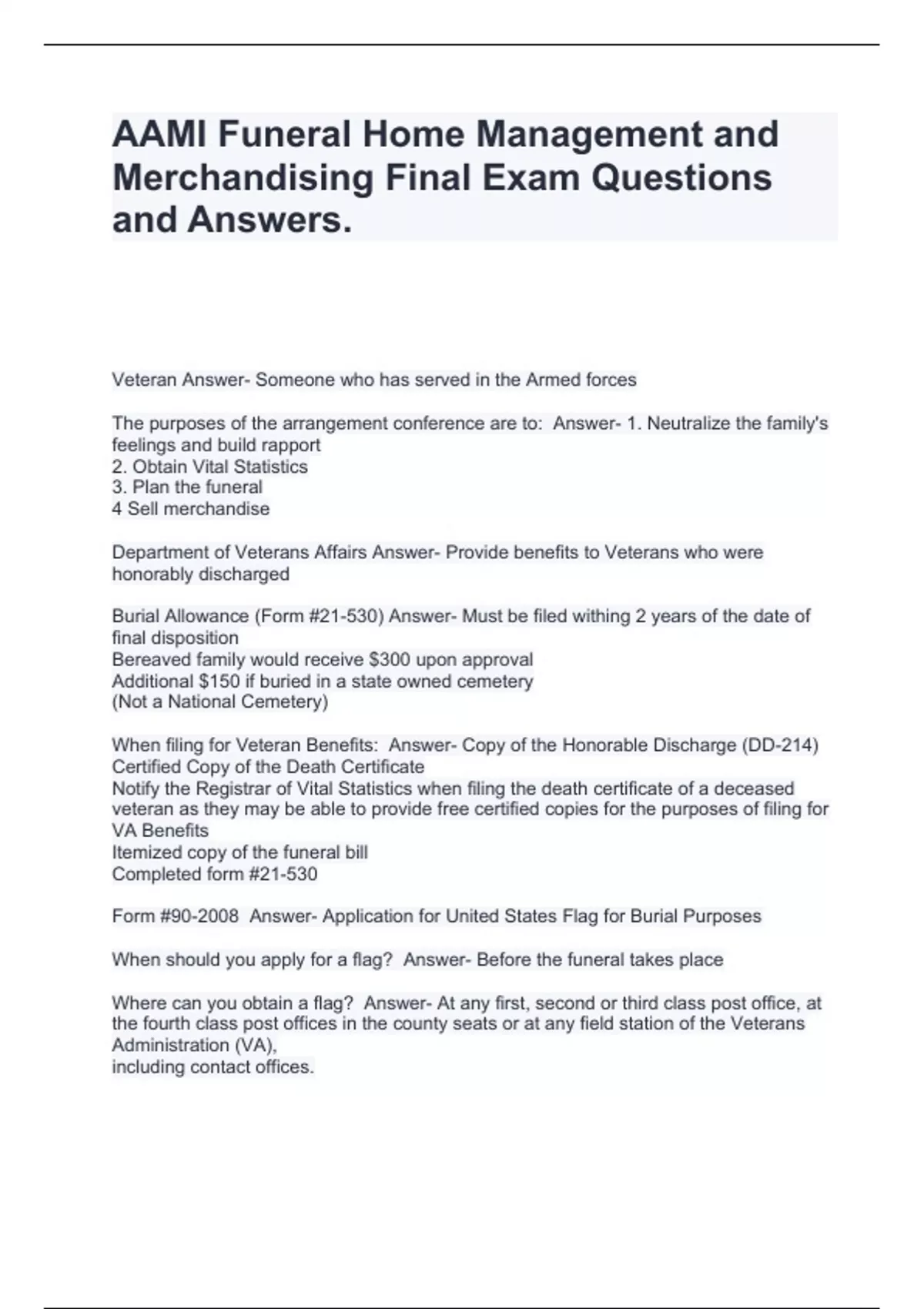 AAMI Funeral Home Management and Merchandising Final Exam Questions and Answers