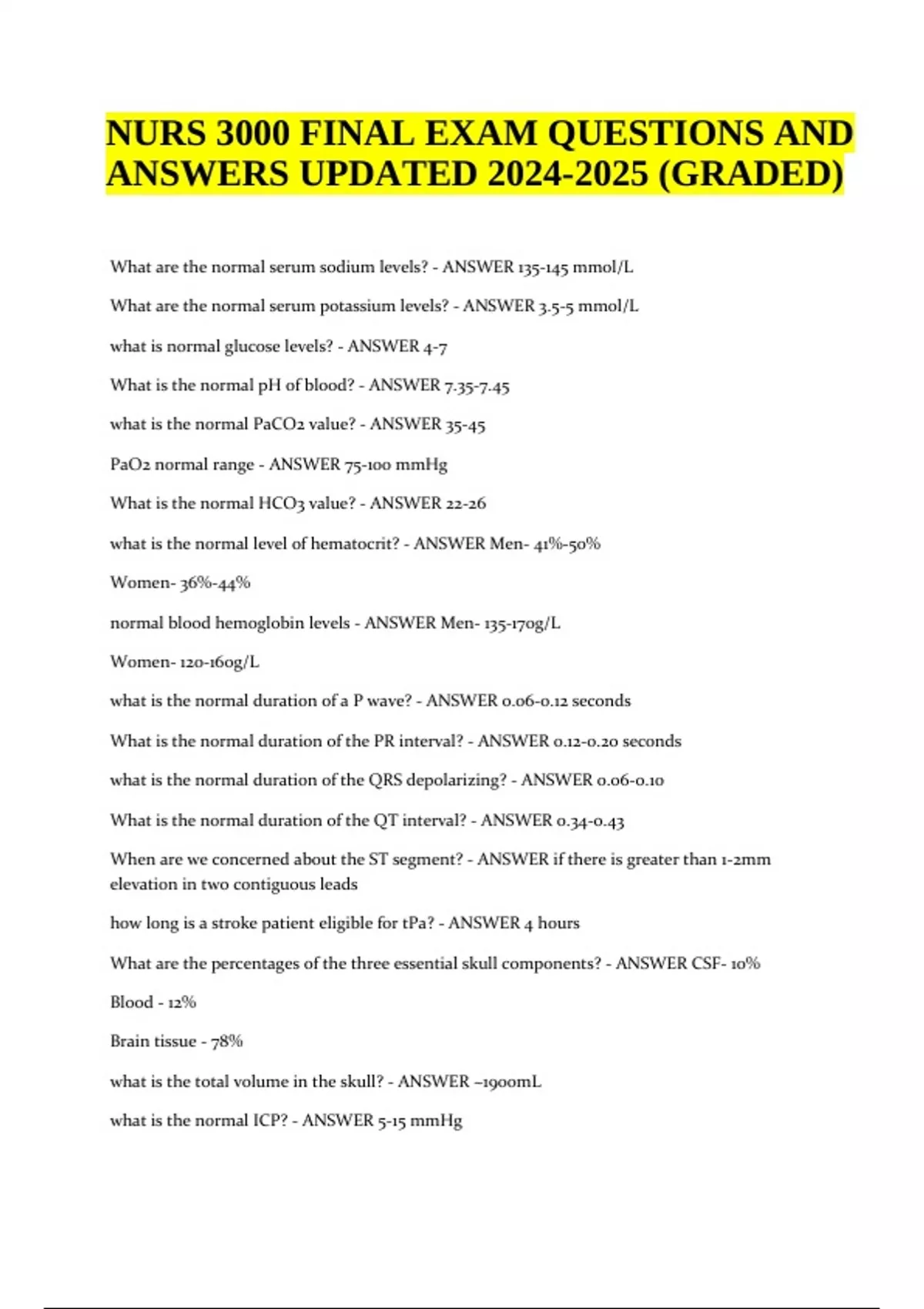 NURS 3000 FINAL EXAM QUESTIONS AND ANSWERS UPDATED (VERIFIED) What are the normal serum sodium levels? - ANSWER 135-145 mmol/L What are the normal serum potassium levels? - ANSWER 3.5-5 mmol/L what is normal glucose levels? - ANSWER 4-7 What is the normal pH of blood? - ANSWER 7.35-7.45 what is the normal PaCO2 value? - ANSWER 35-45 PaO2 normal range - ANSWER 75-100 mmHg What is the normal HCO3 value? - ANSWER 22-26 what is the normal level of hematocrit? - ANSWER Men- 41%-50% Women- 36%-44% normal blood hemoglobin levels - ANSWER Men- 135-170g/L Women- 120-160g/L what is the normal duration of a P wave? - ANSWER 0.06-0.12 seconds What is the normal duration of the PR interval? - ANSWER 0.12-0.20 seconds what is the normal duration of the QRS depolarizing? - ANSWER 0.06-0.10 What is the normal duration of the QT interval? - ANSWER 0.34-0.43 When are we concerned about the ST segment? - ANSWER if there is greater than 1-2mm elevation in two contiguous leads how long is a stroke patient eligible for tPa? - ANSWER 4 hours What are the percentages of the three essential skull components? - ANSWER CSF- 10% Blood - 12% Brain tissue - 78% what is the total volume in the skull? - ANSWER ~1900mL what is the normal ICP? - ANSWER 5-15 mmHg NURS 3000 FINAL EXAM QUESTIONS AND ANSWERS UPDATED (GRADED) What factors impact ICP? - ANSWER blood pressure cardiac function intra-abdominal and intra-thoracic pressure temperature posture blood gasses What is the modified Monro-Kellie doctrine? - ANSWER if the volume of one component increases within the skull and the volume from another component is displaced the total ICP will not change CSF compensates for extra volume by: - ANSWER being displaced into the spinal sub-arachnoid space and can alter CSF production and absorption rates Blood vessels compensate for extra volume by: - ANSWER decreasing the amount of blood coming into the brain venous outflow can be increased or decreased by dilation or constriction of cerebral vessels Brain tissue compensates for extra volume through: - ANSWER distention of the dura or brain tissue compression what is the formula for MAP? - ANSWER diastolic pressure + ((systolic-diastolic pressure)/3) What is the formula for CPP - ANSWER CPP = MAP - ICP what is a normal CPP? - ANSWER 70-100 what CPP is needed for adequate perfusion? - ANSWER 50-60 what happens if CPP is less than 50? less than 30? - ANSWER <50 causes cellular ischemia <30 is incompatible with life What to do when there is a high CPP - ANSWER medication - osmosis diuretic, crystalloid, 3% normal saline check what is causing high blood pressure check the factors that increase ICP what is CPP? - ANSWER cerebral perfusion pressure/Cerebral flood flow if CO2 is high or O2 is low what does this do? - ANSWER relaxes smooth muscles dilates cerebral blood vessels decreases cerebrovascular resistance INCREASES CBF if CO2 is low what happens? - ANSWER constricts smooth muscles constricts cerebral blood vessels increases cerebrovascular resistance DECREASES CBF solve for MAP 82/48 - ANSWER 59 solve for MAP 192/110 - ANSWER 137 solve for CPP BP 112/50 ICP 10 - ANSWER 61 solve for CPP BP: 172/100, ICP: 20 - ANSWER 104 interpret these ABGs including CBF PH:7.28, PaCO2: 52, HCO3: 25, PaO2: 66 - ANSWER uncompensated respiratory acidosis increased CBF hypoxia what happens if PaO2 levels remain low? - ANSWER 1. anaerobic metabolism 2. accumulation of lactic acid 3. increased H+ concentration (lower PH) 4. cerebral environment acidic 5. acidosis causes vasodilation (fluid levels stop auto regulating what does the Pressure-Volume curve determine - ANSWER the relationship between pressure and volume in the cranial vault as expandability (compliance of the brain) decreases the brain can not compensate for the changes in fluid and pressure stage one of the pressure-volume curve - ANSWER modified Monroe-kellie doctrine is still in place stage two of the pressure volume curve - ANSWER compliance is beginning to decrease, increased risk of IICP if pressure or volume is not decreased stage 3 of the pressure-volume curve - ANSWER compensatory mechanisms are becoming exhausted exhibiting headache. changes in LOC & pupillary response small changes in intracranial volume = large increase of ICP stage 4 of the pressure-volume curve - ANSWER lethal IICP at risk for hypo perfusion, herniation, and death if pressure/volume not decreased What is a head injury? - ANSWER trauma that leads to injury of scalp, skull, and/or brain does head trauma include an alteration in LOC? - ANSWER yes no matter how brief