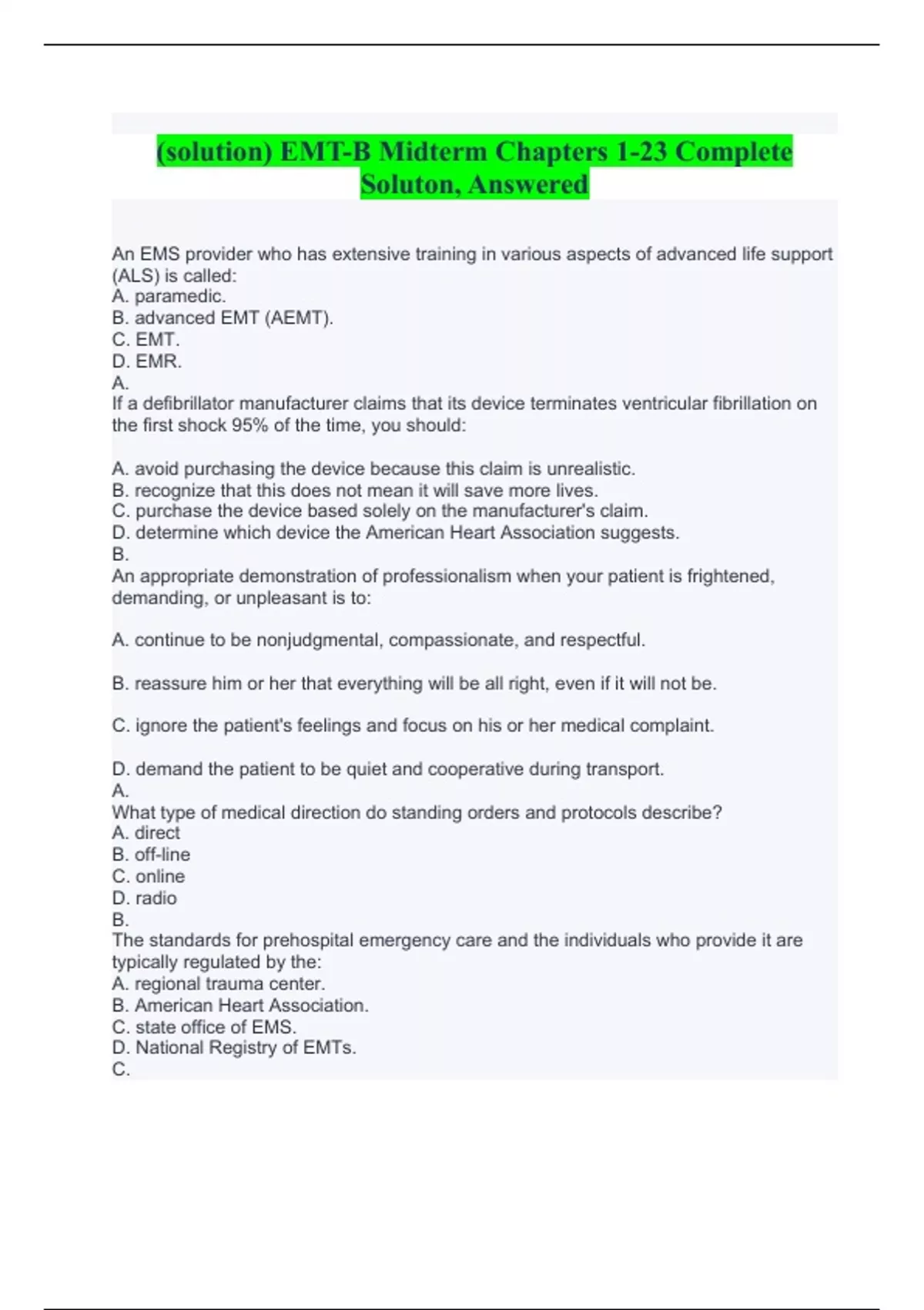 (solution) EMT-B Midterm Chapters 1-23 Complete Soluton, Answered An EMS provider who has extensive training in various aspects of advanced life support (ALS) is called: A. paramedic. B. advanced EMT (AEMT). C. EMT. D. EMR. A. If a defibrillator manufacturer claims that its device terminates ventricular fibrillation on the first shock 95% of the time, you should: A. avoid purchasing the device because this claim is unrealistic. B. recognize that this does not mean it will save more lives. C. purchase the device based solely on the manufacturer's claim. D. determine which device the American Heart Association suggests. B. An appropriate demonstration of professionalism when your patient is frightened, demanding, or unpleasant is to: A. continue to be nonjudgmental, compassionate, and respectful. B. reassure him or her that everything will be all right, even if it will not be. C. ignore the patient's feelings and focus on his or her medical complaint. D. demand the patient to be quiet and cooperative during transport. A. What type of medical direction do standing orders and protocols describe? A. direct B. off-line C. online D. radio B. The standards for prehospital emergency care and the individuals who provide it are typically regulated by the: A. regional trauma center. B. American Heart Association. C. state office of EMS. D. National Registry of EMTs. C. Why are prehospital emergency care guidelines updated on a regular basis? A. EMS providers should be encouraged to actively participate in research and become familiar with data analysis. B. Additional information and evidence indicate that the effectiveness of certain interventions has changed. C. The federal government requires that changes be made to existing emergency care protocols at least every 5 years. D. Statistical data indicate that an increasing number of people are being diagnosed with a particular illness. B. The ____________ deals with the well-being of the EMT, career progression, and EMT compensation. A. human resources department B. local public health department C. office of the medical director D. EMS administrator or chief A. Which of the following statements regarding the EMS medical director and an EMT's scope of practice is correct? A. The EMS medical director can expand the EMT's scope of practice but cannot limit it without state approval. B. An EMT's scope of practice may be expanded by the medical director after proper training and state approval. C. An EMT's scope of practice is exclusively regulated by the state EMS office, not the EMS medical director. D. The EMS medical director can expand or limit an individual EMT's scope of practice without state approval. B. According to the National EMS Scope of Practice Model, an EMT should be able to: A. insert a peripheral intravenous (IV) line and infuse fluids. B. interpret a basic electrocardiogram (ECG) rhythm and treat accordingly. C. assist a patient with certain prescribed medications. D. administer epinephrine via the subcutaneous route. C. As an EMT, you may be authorized to administer aspirin to a patient with chest pain based on: A. your local EMS protocols. B. an order from a paramedic. C. the patient's condition. D. the transport time to the hospital. A. EMRs such as fire fighters, law enforcement officers, and park rangers, are an integral part of the EMS system because: A. they are trained to assist paramedics with certain procedures. B. they can initiate ALS before EMS arrival. C. the presence of a person trained to initiate basic life support (BLS) care cannot be ensured. D. the average response time for the EMT crew is approximately 15 minutes. C. Which of the following statements regarding the NREMT is correct? A. EMS training standards are regulated by the NREMT. B. The NREMT is a governmental agency that certifies EMTs. C. The NREMT provides a national standard for EMS testing. D. The NREMT is the exclusive certifying body for EMTs. C. Obtaining continuing medical education is the responsibility of the: A. State Bureau of EMS. B. EMS training officer. C. EMS medical director. D. individual EMT. D. Which of the following statements regarding the Americans With Disabilities Act (ADA) of 1990 is correct? A. The ADA prohibits employers from failing to provide full and equal employment to the disabled. B. The ADA only applies to individuals with a diagnosed and well-documented physical disability. C. The requirements to successfully complete an EMT program are different for those who are disabled. D. According to the ADA, EMT candidates with a documented disability are exempt from taking the NREMT exam A. Which of the following scenarios does NOT involve the administration of ALS? A. a 61-year-old trauma patient whose chest is decompressed with a needle