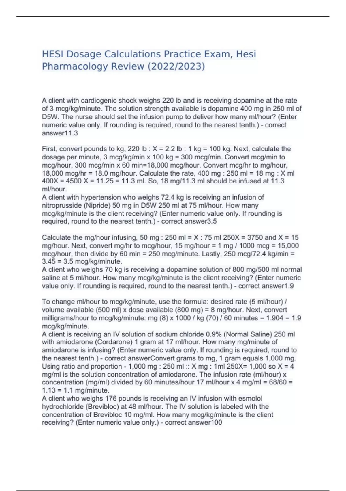 HESI Dosage Calculations Practice Exam, Hesi Pharmacology Review (2022/2023) A client with cardiogenic shock weighs 220 lb and is receiving dopamine at the rate of 3 mcg/kg/minute. The solution strength available is dopamine 400 mg in 250 ml of D5W. The nurse should set the infusion pump to deliver how many ml/hour? (Enter numeric value only. If rounding is required, round to the nearest tenth.) - correct answer11.3 First, convert pounds to kg, 220 lb : X = 2.2 lb : 1 kg = 100 kg. Next, calculate the dosage per minute, 3 mcg/kg/min x 100 kg = 300 mcg/min. Convert mcg/min to mcg/hour, 300 mcg/min x 60 min=18,000 mcg/hour. Convert mcg/hr to mg/hour, 18,000 mcg/hr = 18.0 mg/hour. Calculate the rate, 400 mg : 250 ml = 18 mg : X ml 400X = 4500 X = 11.25 = 11.3 ml. So, 18 mg/11.3 ml should be infused at 11.3 ml/hour. A client with hypertension who weighs 72.4 kg is receiving an infusion of nitroprusside (Nipride) 50 mg in D5W 250 ml at 75 ml/hour. How many mcg/kg/minute is the client receiving? (Enter numeric value only. If rounding is required, round to the nearest tenth.) - correct answer3.5 Calculate the mg/hour infusing, 50 mg : 250 ml = X : 75 ml 250X = 3750 and X = 15 mg/hour. Next, convert mg/hr to mcg/hour, 15 mg/hour = 1 mg / 1000 mcg = 15,000 mcg/hour, then divide by 60 min = 250 mcg/minute. Lastly, 250 mcg/72.4 kg/min = 3.45 = 3.5 mcg/kg/minute. A client who weighs 70 kg is receiving a dopamine solution of 800 mg/500 ml normal saline at 5 ml/hour. How many mcg/kg/minute is the client receiving? (Enter numeric value only. If rounding is required, round to the nearest tenth.) - correct answer1.9
