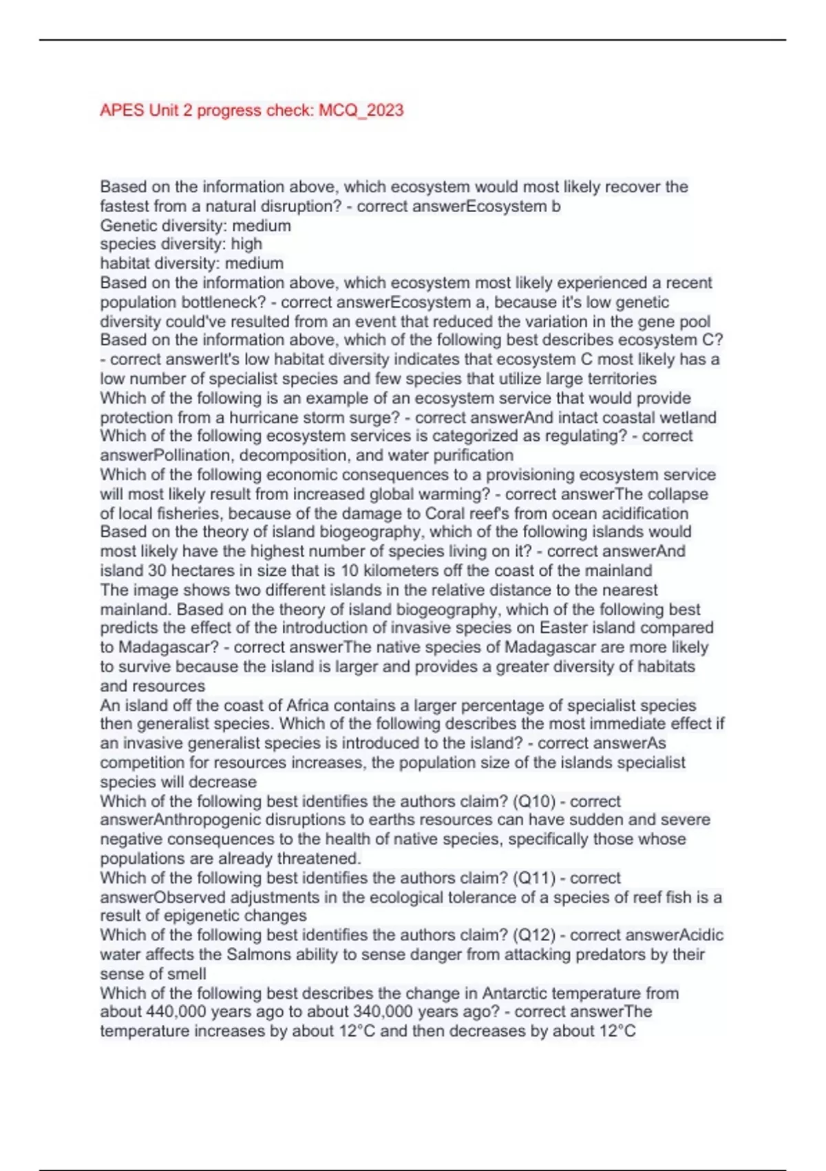 APES Unit 2 progress check: MCQ_2023 Based on the information above, which ecosystem would most likely recover the fastest from a natural disruption? - correct answerEcosystem b Genetic diversity: medium species diversity: high habitat diversity: medium Based on the information above, which ecosystem most likely experienced a recent population bottleneck? - correct answerEcosystem a, because it's low genetic diversity could've resulted from an event that reduced the variation in the gene pool Based on the information above, which of the following best describes ecosystem C? - correct answerIt's low habitat diversity indicates that ecosystem C most likely has a low number of specialist species and few species that utilize large territories Which of the following is an example of an ecosystem service that would provide protection from a hurricane storm surge? - correct answerAnd intact coastal wetland Which of the following ecosystem services is categorized as regulating? - correct answerPollination, decomposition, and water purification
