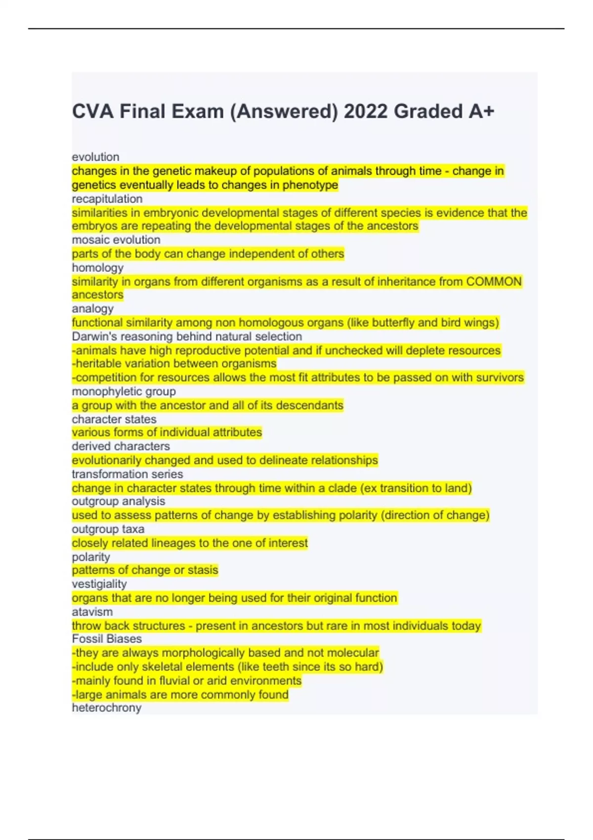 CVA Final Exam (Answered) 2022 Graded A+ evolution changes in the genetic makeup of populations of animals through time - change in genetics eventually leads to changes in phenotype recapitulation similarities in embryonic developmental stages of different species is evidence that the embryos are repeating the developmental stages of the ancestors mosaic evolution parts of the body can change independent of others homology similarity in organs from different organisms as a result of inheritance from COMMON ancestors analogy functional similarity among non homologous organs (like butterfly and bird wings) Darwin's reasoning behind natural selection -animals have high reproductive potential and if unchecked will deplete resources -heritable variation between organisms -competition for resources allows the most fit attributes to be passed on with survivors monophyletic group a group with the ancestor and all of its descendants character states various forms of individual attributes derived characters evolutionarily changed and used to delineate relationships transformation series change in character states through time within a clade (ex transition to land) outgroup analysis used to assess patterns of change by establishing polarity (direction of change) outgroup taxa closely related lineages to the one of interest polarity patterns of change or stasis vestigiality organs that are no longer being used for their original function atavism throw back structures - present in ancestors but rare in most individuals today Fossil Biases -they are always morphologically based and not molecular -include only skeletal elements (like teeth since its so hard) -mainly found in fluvial or arid environments -large animals are more commonly found heterochrony evolutionary change to developmental timing or rates anatomical position the standard position an animal should be in before we embark on explaining direction and movement bilateral symmetry body is divided by a mid-sagittal plane forming two mirror images Lateral away from midline (farther from the middle) medial closer to the midline proximal closer to the top of the appendage distal closer to the tip of the appendage (farther from the start) frontal plane divides an animal into dorsal and ventral dorsal above the frontal plane (top when laying down) ventral under the frontal plane (belly) transverse plane plane dividing the front and back cranial (anterior) towards the head caudal (posterior) towards the tail flexion bending of two parts towards one another usually across a joint extension increasing the gap between two parts through bending adduction bringing the structure towards the midline abduction moving a structure away from the midline rotation pivoting about an elements axis protraction moving a structure forward retraction moving a structure backwards from which it came Key features of vertebrate 1. vertebral column attached to notochord 2. two semicircular canals 3. radial fin muscles 4. dermal bone (armor) Features in vertebrate outgroups head, notochord, post-anal tail, pharyngeal slits, endostyle, dorsal nerve tube, myomeres, dorsal and ventral aorta Craniata group hagfish (myxiniformes) and vertebrata Craniate key features braincase, neural crest cells, complex sense organs, cranial nerves, tripartite brain, respiratory gills, muscular gut tube, heart, and hemoglobin Neural crest cells give rise to cranial nerves, meninges of the brain, braincase, gill bars and bones (in vertebrates) sensory placodes ectoderm that invaginates to form sensory structures like nose, lateral line and lens of eye semicircular canals to sense pitch, roll and yaw