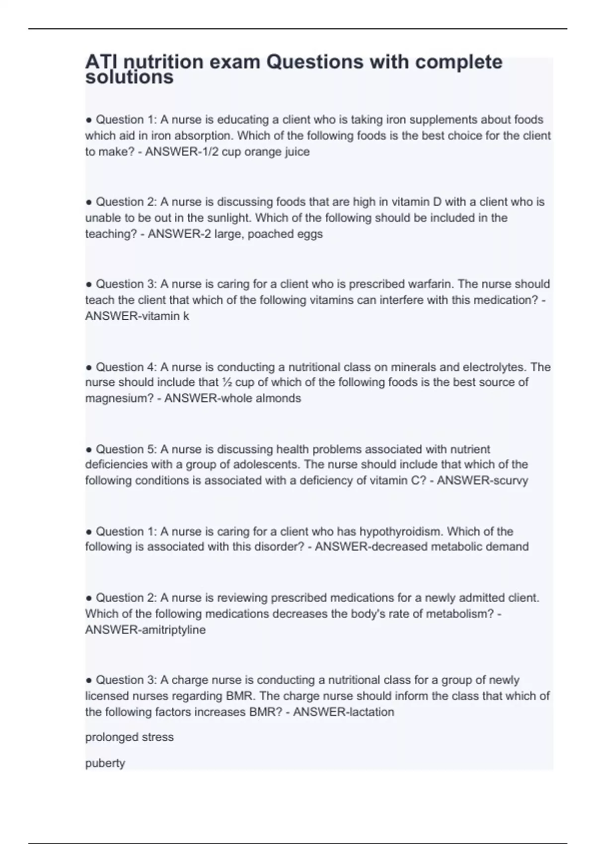 ● Question 1: A nurse is educating a client who is taking iron supplements about foods which aid in iron absorption. Which of the following foods is the best choice for the client to make? - ANSWER-1/2 cup orange juice ● Question 2: A nurse is discussing foods that are high in vitamin D with a client who is unable to be out in the sunlight. Which of the following should be included in the teaching? - ANSWER-2 large, poached eggs ● Question 3: A nurse is caring for a client who is prescribed warfarin. The nurse should teach the client that which of the following vitamins can interfere with this medication? - ANSWER-vitamin k ● Question 4: A nurse is conducting a nutritional class on minerals and electrolytes. The nurse should include that ½ cup of which of the following foods is the best source of magnesium? - ANSWER-whole almonds ● Question 5: A nurse is discussing health problems associated with nutrient deficiencies with a group of adolescents. The nurse should include that which of the following conditions is associated with a deficiency of vitamin C? - ANSWER-scurvy ● Question 1: A nurse is caring for a client who has hypothyroidism. Which of the following is associated with this disorder? - ANSWER-decreased metabolic demand ● Question 2: A nurse is reviewing prescribed medications for a newly admitted client. Which of the following medications decreases the body's rate of metabolism? - ANSWER-amitriptyline ● Question 3: A charge nurse is conducting a nutritional class for a group of newly licensed nurses regarding BMR. The charge nurse should inform the class that which of the following factors increases BMR? - ANSWER-lactation prolonged stress puberty