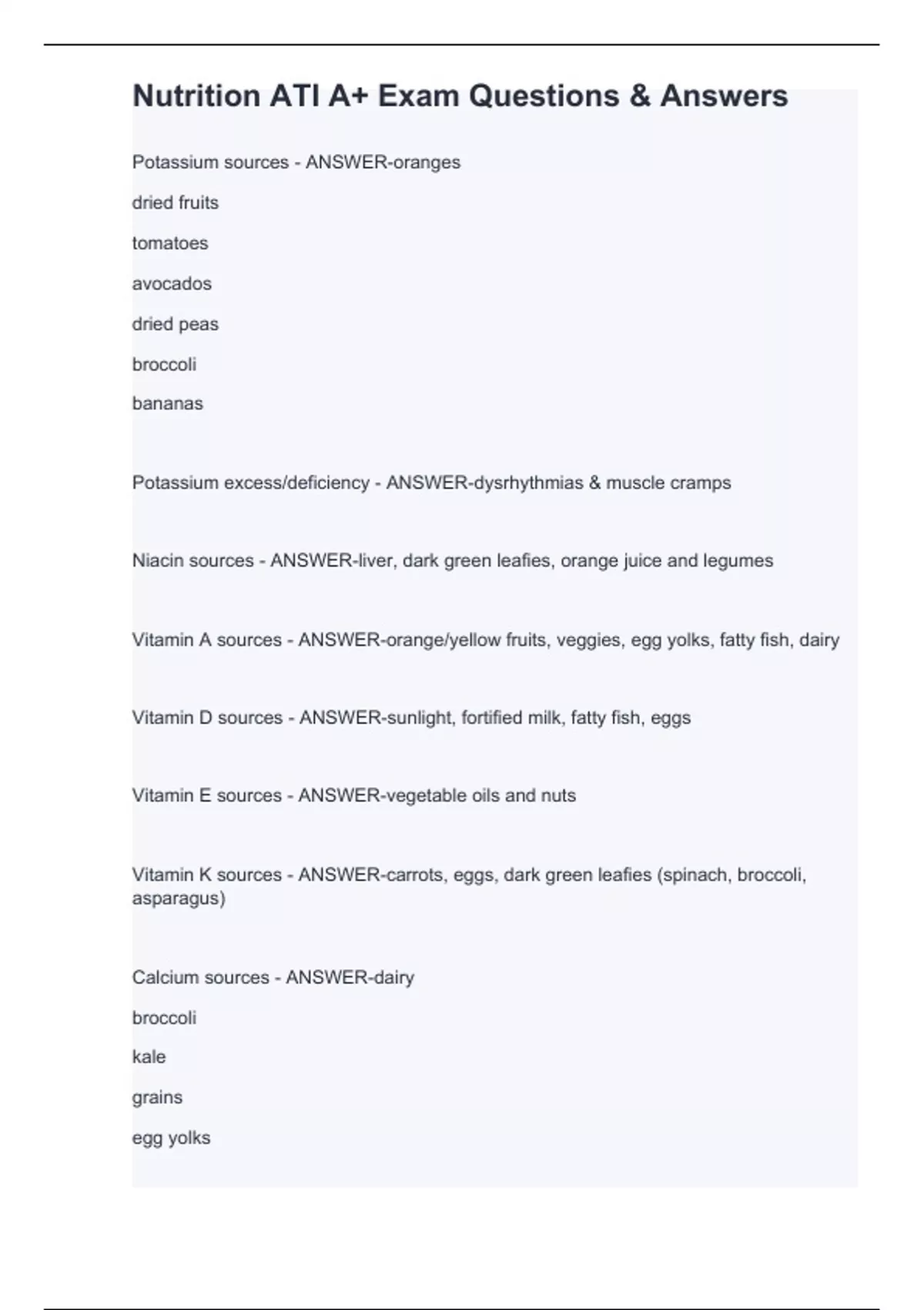 Potassium sources - ANSWER-oranges dried fruits tomatoes avocados dried peas broccoli bananas Potassium excess/deficiency - ANSWER-dysrhythmias & muscle cramps Niacin sources - ANSWER-liver, dark green leafies, orange juice and legumes Vitamin A sources - ANSWER-orange/yellow fruits, veggies, egg yolks, fatty fish, dairy Vitamin D sources - ANSWER-sunlight, fortified milk, fatty fish, eggs Vitamin E sources - ANSWER-vegetable oils and nuts Vitamin K sources - ANSWER-carrots, eggs, dark green leafies (spinach, broccoli, asparagus) Calcium sources - ANSWER-dairy broccoli kale grains egg yolks
