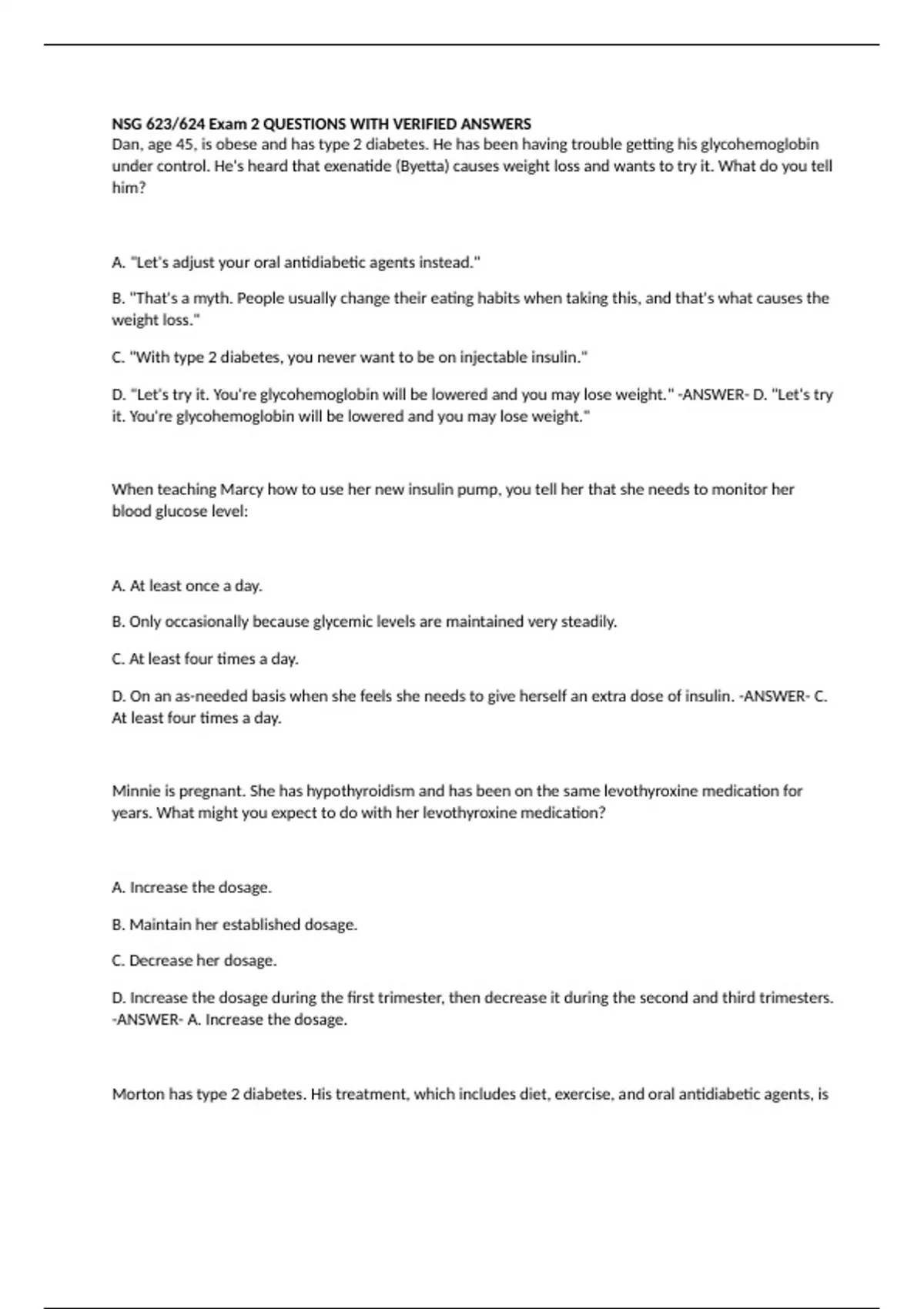 glycohemoglobin under control. He's heard that exenatide (Byetta) causes weight loss and wants to try it. What do you tell him? A. "Let's adjust your oral antidiabetic agents instead." B. "That's a myth. People usually change their eating habits when taking this, and that's what causes the weight loss." C. "With type 2 diabetes, you never want to be on injectable insulin." D. "Let's try it. You're glycohemoglobin will be lowered and you may lose weight." -ANSWER- D. "Let's try it. You're glycohemoglobin will be lowered and you may lose weight." When teaching Marcy how to use her new insulin pump, you tell her that she needs to monitor her blood glucose level: A. At least once a day. B. Only occasionally because glycemic levels are maintained very steadily. C. At least four times a day. D. On an as-needed basis when she feels she needs to give herself an extra dose of insulin. -ANSWER- C. At least four times a day. Minnie is pregnant. She has hypothyroidism and has been on the same levothyroxine medication for years. What might you expect to do with her levothyroxine medication? A. Increase the dosage. B. Maintain her established dosage. C. Decrease her dosage. D. Increase the dosage during the first trimester, then decrease it during the second and third trimesters. -ANSWER- A. Increase the dosage. Morton has type 2 diabetes. His treatment, which includes diet, exercise, and oral antidiabetic agents, is insufficient to achieve acceptable glycemic control. Your next course of action is to: A. Increase the dosage of the oral antidiabetic agents. B. Add a nighttime dosage of long-acting insulin to the regimen. C. Discontinue the oral antidiabetic agents and start insulin therapy. D. Suggest treatment using an insulin pump. -ANSWER- B. Add a nighttime dosage of long-acting insulin to the regimen. After a subtotal thyroidectomy, it is crucial to assess: A. Heart tones. B. For peripheral edema. C. Speaking ability. D. Skin turgor. -ANSWER- C. Speaking ability. Jane has insulin-dependent diabetes mellitus and has been experiencing hyperglycemia before dinner. A possible solution to this problem is to: A. Adjust her morning dose of rapid-acting insulin. B. Increase her midafternoon snack. C. Add physical activity between lunch and dinner. D. Reduce the amount of carbohydrates at dinner. -ANSWER- C. Add physical activity between lunch and dinner. Why is parathyroid hormone secretion increased during pregnancy? A. To meet the increased stress demands on the mother B. To meet the increased requirements for calcium and vitamin D for fetal skeletal growth C. To help prevent neural tube defects in the fetus D. To help promote neurological growth of the developing brain in the fetus -ANSWER- B. To meet the increased requirements for calcium and vitamin D for fetal skeletal growth