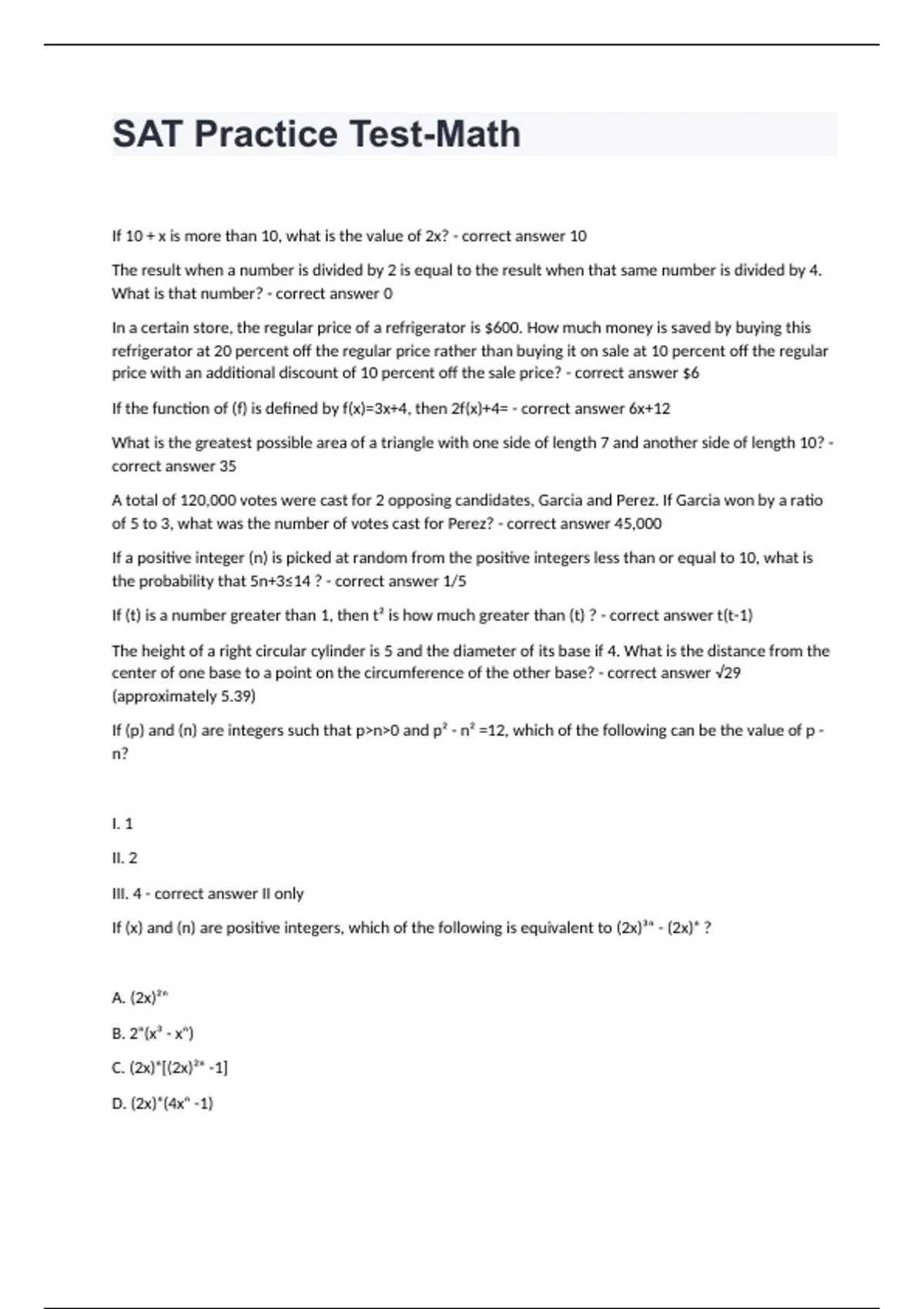 SAT Practice Test-Math If 10 + x is more than 10, what is the value of 2x? - correct answer 10 The result when a number is divided by 2 is equal to the result when that same number is divided by 4. What is that number? - correct answer 0 In a certain store, the regular price of a refrigerator is $600. How much money is saved by buying this refrigerator at 20 percent off the regular price rather than buying it on sale at 10 percent off the regular price with an additional discount of 10 percent off the sale price? - correct answer $6 If the function of (f) is defined by f(x)=3x+4, then 2f(x)+4= - correct answer 6x+12 What is the greatest possible area of a triangle with one side of length 7 and another side of length 10? - correct answer 35 A total of 120,000 votes were cast for 2 opposing candidates, Garcia and Perez. If Garcia won by a ratio of 5 to 3, what was the number of votes cast for Perez? - correct answer 45,000 If a positive integer (n) is picked at random from the positive integers less than or equal to 10, what is the probability that 5n+3≤14 ? - correct answer 1/5 If (t) is a number greater than 1, then t² is how much greater than (t) ? - correct answer t(t-1) The height of a right circular cylinder is 5 and the diameter of its base if 4. What is the distance from the center of one base to a point on the circumference of the other base? - correct answer √29 (approximately 5.39) If (p) and (n) are integers such that p>n>0 and p² - n² =12, which of the following can be the value of p - n? I. 1 II. 2 III. 4 - correct answer II only If (x) and (n) are positive integers, which of the following is equivalent to (2x)³ⁿ - (2x)ⁿ ? A. (2x)²ⁿ B. 2ⁿ(x³ - xⁿ) C. (2x)ⁿ[(2x)²ⁿ -1] D. (2x)ⁿ(4xⁿ -1)