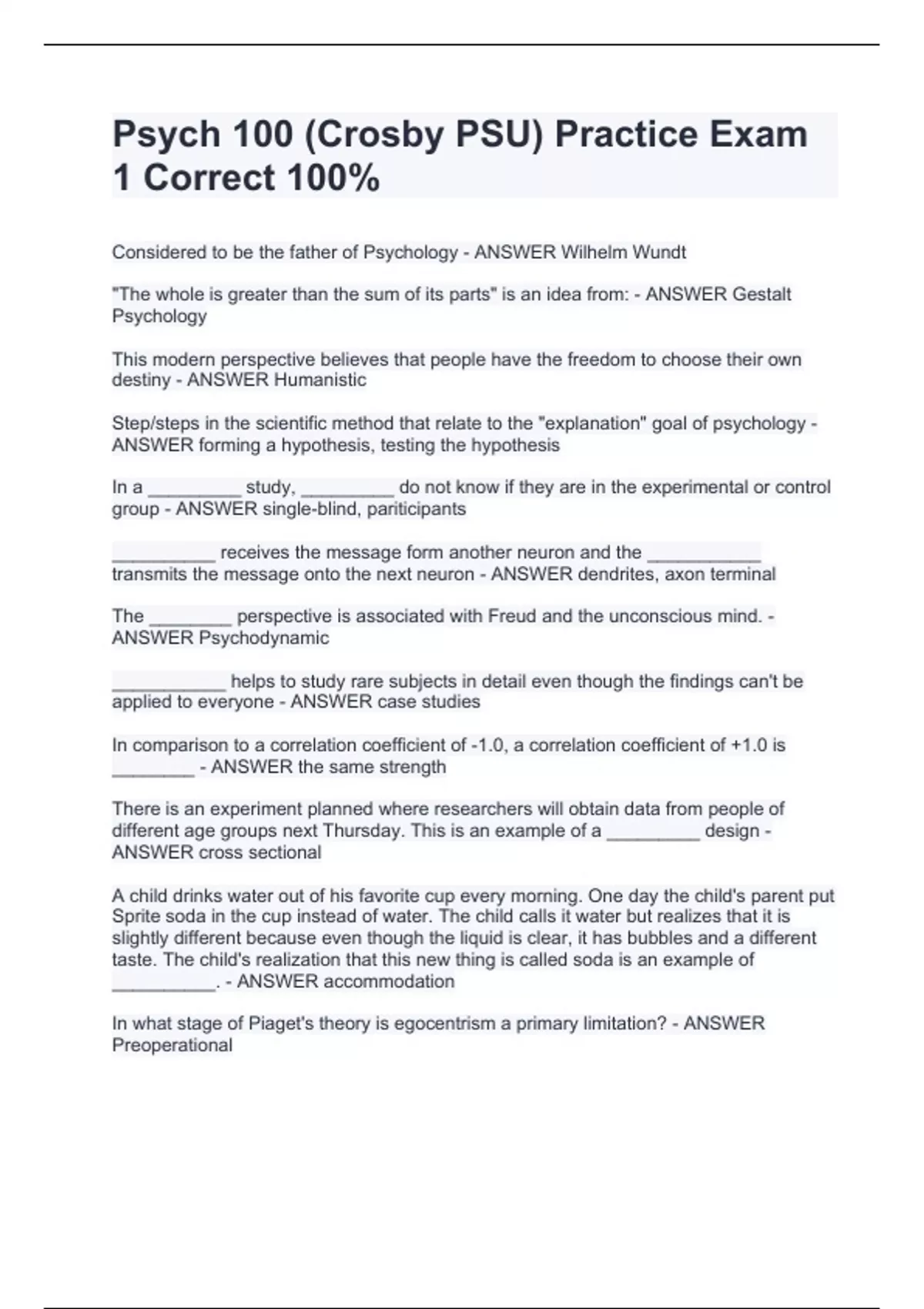 Psych 100 (Crosby PSU) Practice Exam 1 Correct 100%