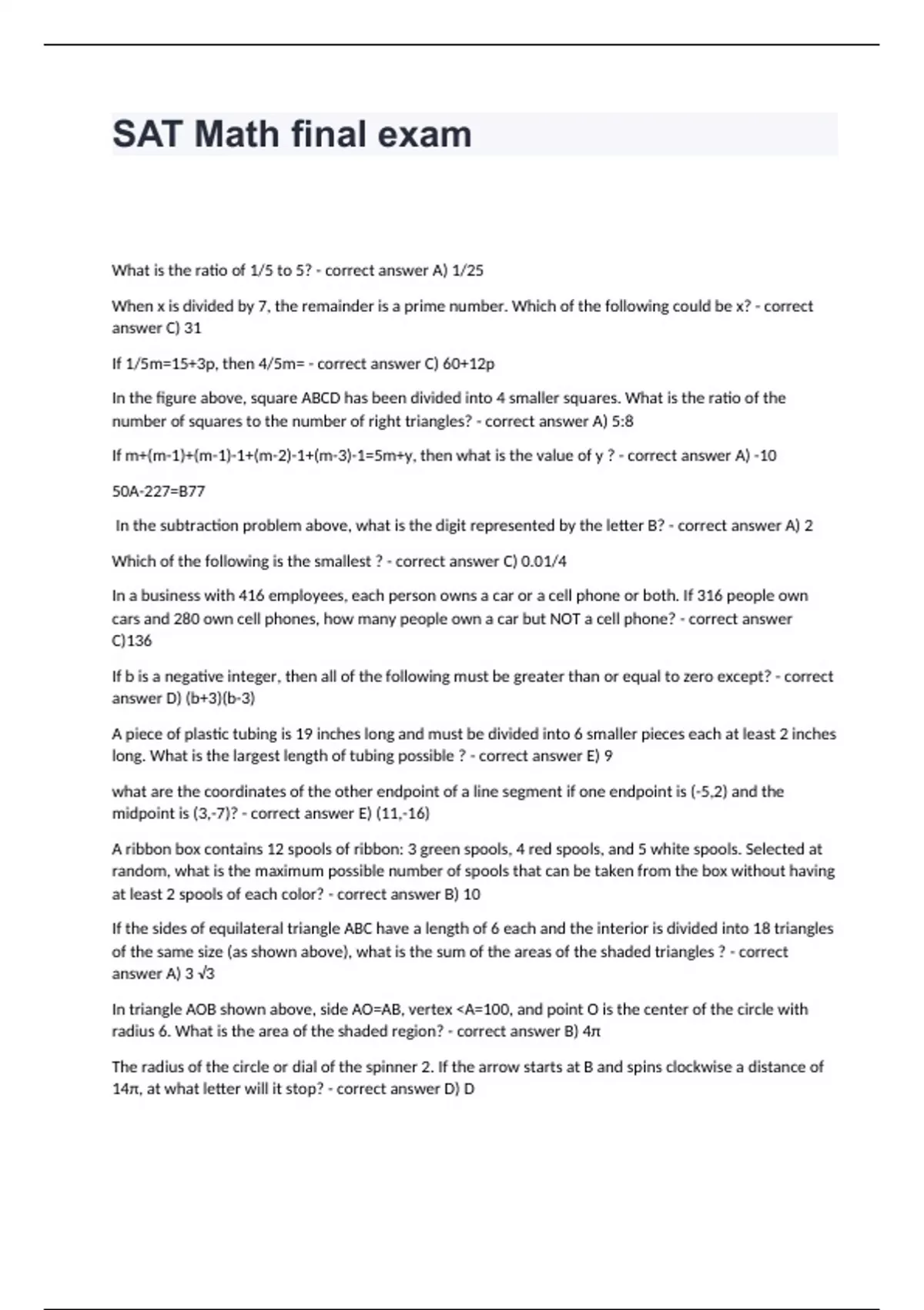 SAT Math final exam What is the ratio of 1/5 to 5? - correct answer A) 1/25 When x is divided by 7, the remainder is a prime number. Which of the following could be x? - correct answer C) 31 If 1/5m=15+3p, then 4/5m= - correct answer C) 60+12p In the figure above, square ABCD has been divided into 4 smaller squares. What is the ratio of the number of squares to the number of right triangles? - correct answer A) 5:8 If m+(m-1)+(m-1)-1+(m-2)-1+(m-3)-1=5m+y, then what is the value of y ? - correct answer A) -10 50A-227=B77 In the subtraction problem above, what is the digit represented by the letter B? - correct answer A) 2 Which of the following is the smallest ? - correct answer C) 0.01/4 In a business with 416 employees, each person owns a car or a cell phone or both. If 316 people own cars and 280 own cell phones, how many people own a car but NOT a cell phone? - correct answer C)136 If b is a negative integer, then all of the following must be greater than or equal to zero except? - correct answer D) (b+3)(b-3) A piece of plastic tubing is 19 inches long and must be divided into 6 smaller pieces each at least 2 inches long. What is the largest length of tubing possible ? - correct answer E) 9 what are the coordinates of the other endpoint of a line segment if one endpoint is (-5,2) and the midpoint is (3,-7)? - correct answer E) (11,-16) A ribbon box contains 12 spools of ribbon: 3 green spools, 4 red spools, and 5 white spools. Selected at random, what is the maximum possible number of spools that can be taken from the box without having at least 2 spools of each color? - correct answer B) 10 If the sides of equilateral triangle ABC have a length of 6 each and the interior is divided into 18 triangles of the same size (as shown above), what is the sum of the areas of the shaded triangles ? - correct answer A) 3 √3 In triangle AOB shown above, side AO=AB, vertex <A=100, and point O is the center of the circle with radius 6. What is the area of the shaded region? - correct answer B) 4π The radius of the circle or dial of the spinner 2. If the arrow starts at B and spins clockwise a distance of 14π, at what letter will it stop? - correct answer D) D