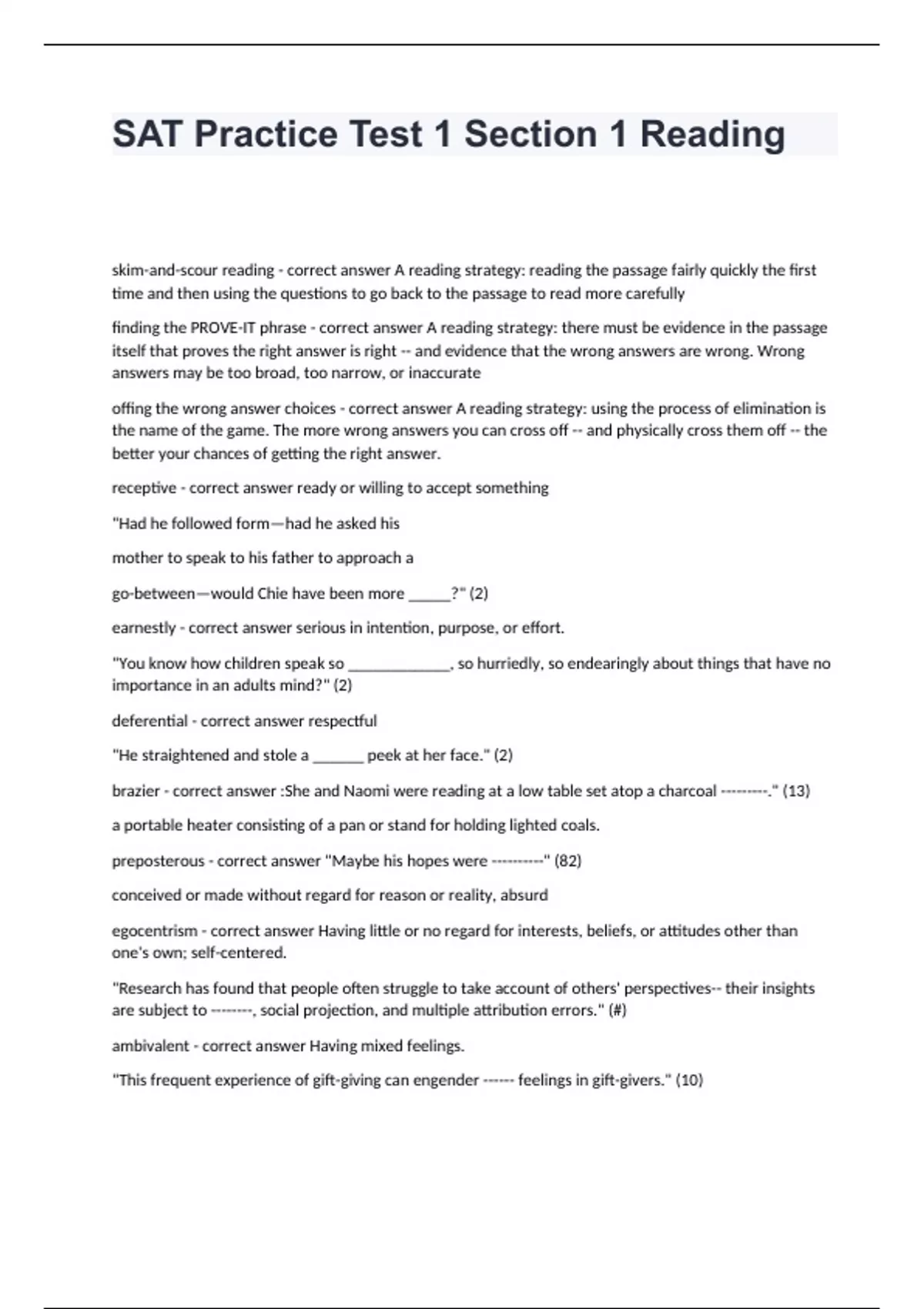 SAT Practice Test 1 Section 1 Reading skim-and-scour reading - correct answer A reading strategy: reading the passage fairly quickly the first time and then using the questions to go back to the passage to read more carefully finding the PROVE-IT phrase - correct answer A reading strategy: there must be evidence in the passage itself that proves the right answer is right -- and evidence that the wrong answers are wrong. Wrong answers may be too broad, too narrow, or inaccurate offing the wrong answer choices - correct answer A reading strategy: using the process of elimination is the name of the game. The more wrong answers you can cross off -- and physically cross them off -- the better your chances of getting the right answer. receptive - correct answer ready or willing to accept something "Had he followed form—had he asked his mother to speak to his father to approach a go-between—would Chie have been more _____?" (2) earnestly - correct answer serious in intention, purpose, or effort. "You know how children speak so ____________, so hurriedly, so endearingly about things that have no importance in an adults mind?" (2) deferential - correct answer respectful "He straightened and stole a ______ peek at her face." (2) brazier - correct answer :She and Naomi were reading at a low table set atop a charcoal ---------." (13) a portable heater consisting of a pan or stand for holding lighted coals. preposterous - correct answer "Maybe his hopes were ----------" (82) conceived or made without regard for reason or reality, absurd egocentrism - correct answer Having little or no regard for interests, beliefs, or attitudes other than one's own; self-centered. "Research has found that people often struggle to take account of others' perspectives-- their insights are subject to --------, social projection, and multiple attribution errors." (#) ambivalent - correct answer Having mixed feelings. "This frequent experience of gift-giving can engender ------ feelings in gift-givers." (10)