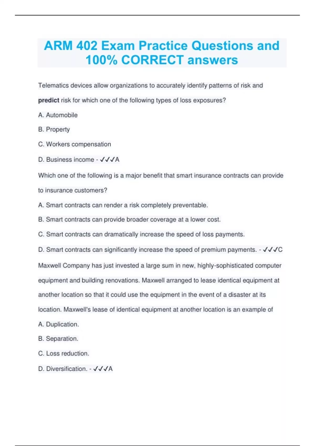 ARM 402 Exam Practice Questions and 100% CORRECT answers Telematics devices allow organizations to accurately identify patterns of risk and predict risk for which one of the following types of loss exposures? A. Automobile B. Property C. Workers compensation D. Business income - A Which one of the following is a major benefit that smart insurance contracts can provide to insurance customers? A. Smart contracts can render a risk completely preventable. B. Smart contracts can provide broader coverage at a lower cost. C. Smart contracts can dramatically increase the speed of loss payments. D. Smart contracts can significantly increase the speed of premium payments. - C Maxwell Company has just invested a large sum in new, highly-sophisticated computer equipment and building renovations. Maxwell arranged to lease identical equipment at another location so that it could use the equipment in the event of a disaster at its location. Maxwell's lease of identical equipment at another location is an example of A. Duplication. B. Separation. C. Loss reduction. D. Diversification. - A Olivia is planning a meeting to explain a new cyber security procedure. She expects that the meeting will be impeded by hidden agendas. Which one of the following is the best way for Olivia to deal with potential hidden agendas? A. Olivia should refuse to take questions during her meeting, and request that any questions be forwarded to her in writing after the meeting. B. Olivia should start the meeting by stating that she does not expect everyone like the new procedure, but they must accept it. C. Olivia should start the meeting by asking participants to state their concerns or feeling about the procedure. D. Olivia should hold a separate meeting for those individuals who she suspects have a hidden agenda. - C Which one of the following is a common problem with meetings that leaders should try to avoid? A. Trying to stick to an agenda and avoid interruptions B. Committing to an end time, as well as a start time C. Having the wrong people attend D. Stating the objective in writing before the meeting - C Which one of the following statements about correlation and covariance is true? A. Covariance is a scaled version of correlation and ranges from -1 to +1. B. The correlation between variables ranges from 0 to +1. C. Covariance measures the extent to which variables move together or independently. D. Correlation measures causality. - C