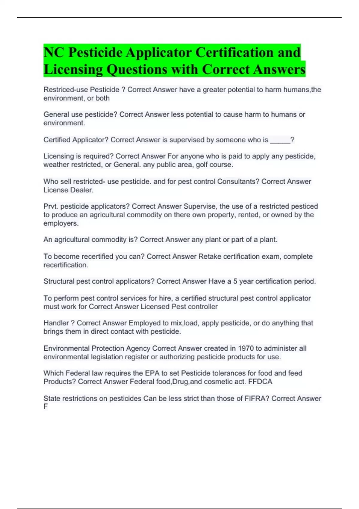Restriced-use Pesticide ? Correct Answer have a greater potential to harm humans,the environment, or both General use pesticide? Correct Answer less potential to cause harm to humans or environment. Certified Applicator? Correct Answer is supervised by someone who is _____? Licensing is required? Correct Answer For anyone who is paid to apply any pesticide, weather restricted, or General. any public area, golf course. Who sell restricted- use pesticide. and for pest control Consultants? Correct Answer License Dealer. Prvt. pesticide applicators? Correct Answer Supervise, the use of a restricted pesticed to produce an agricultural commodity on there own property, rented, or owned by the employers. An agricultural commodity is? Correct Answer any plant or part of a plant. To become recertified you can? Correct Answer Retake certification exam, complete recertification. Structural pest control applicators? Correct Answer Have a 5 year certification period. To perform pest control services for hire, a certified structural pest control applicator must work for Correct Answer Licensed Pest controller Handler ? Correct Answer Employed to mix,load, apply pesticide, or do anything that brings them in direct contact with pesticide. Environmental Protection Agency Correct Answer created in 1970 to administer all environmental legislation register or authorizing pesticide products for use. Which Federal law requires the EPA to set Pesticide tolerances for food and feed Products? Correct Answer Federal food,Drug,and cosmetic act. FFDCA State restrictions on pesticides Can be less strict than those of FIFRA? Correct Answer F