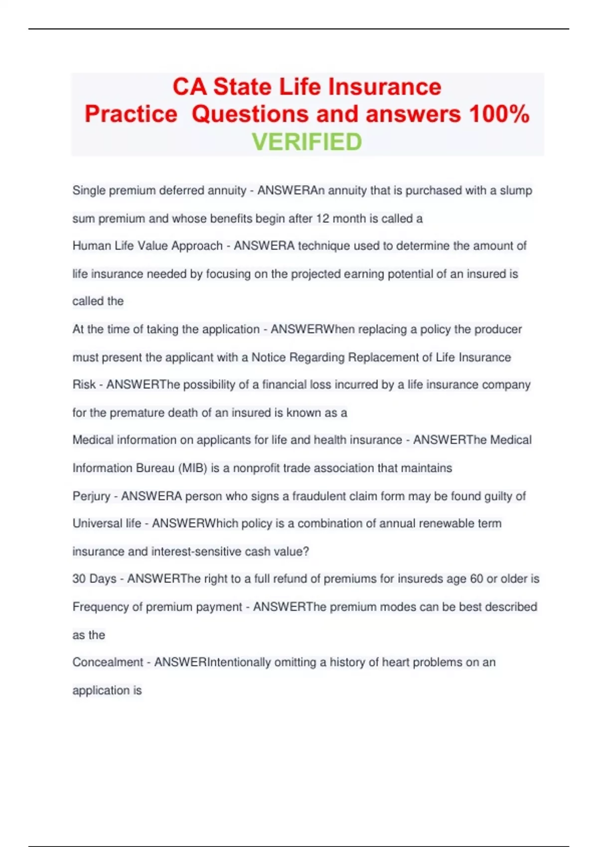 Single premium deferred annuity - ANSWERAn annuity that is purchased with a slump sum premium and whose benefits begin after 12 month is called a Human Life Value Approach - ANSWERA technique used to determine the amount of life insurance needed by focusing on the projected earning potential of an insured is called the At the time of taking the application - ANSWERWhen replacing a policy the producer must present the applicant with a Notice Regarding Replacement of Life Insurance Risk - ANSWERThe possibility of a financial loss incurred by a life insurance company for the premature death of an insured is known as a Medical information on applicants for life and health insurance - ANSWERThe Medical Information Bureau (MIB) is a nonprofit tra