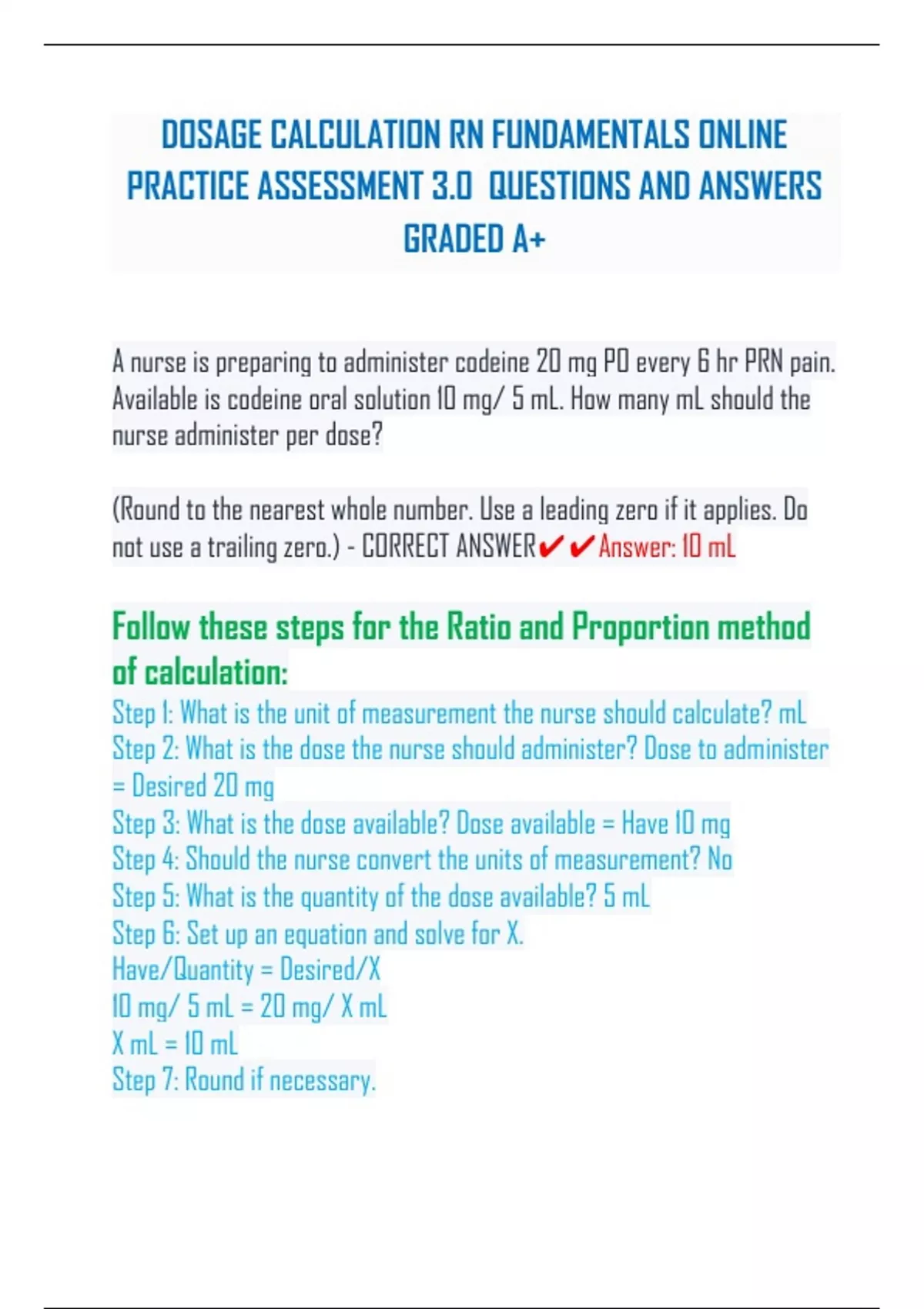 DOSAGE CALCULATION RN FUNDAMENTALS ONLINE PRACTICE ASSESSMENT 3.0 QUESTIONS AND ANSWERS GRADED A+