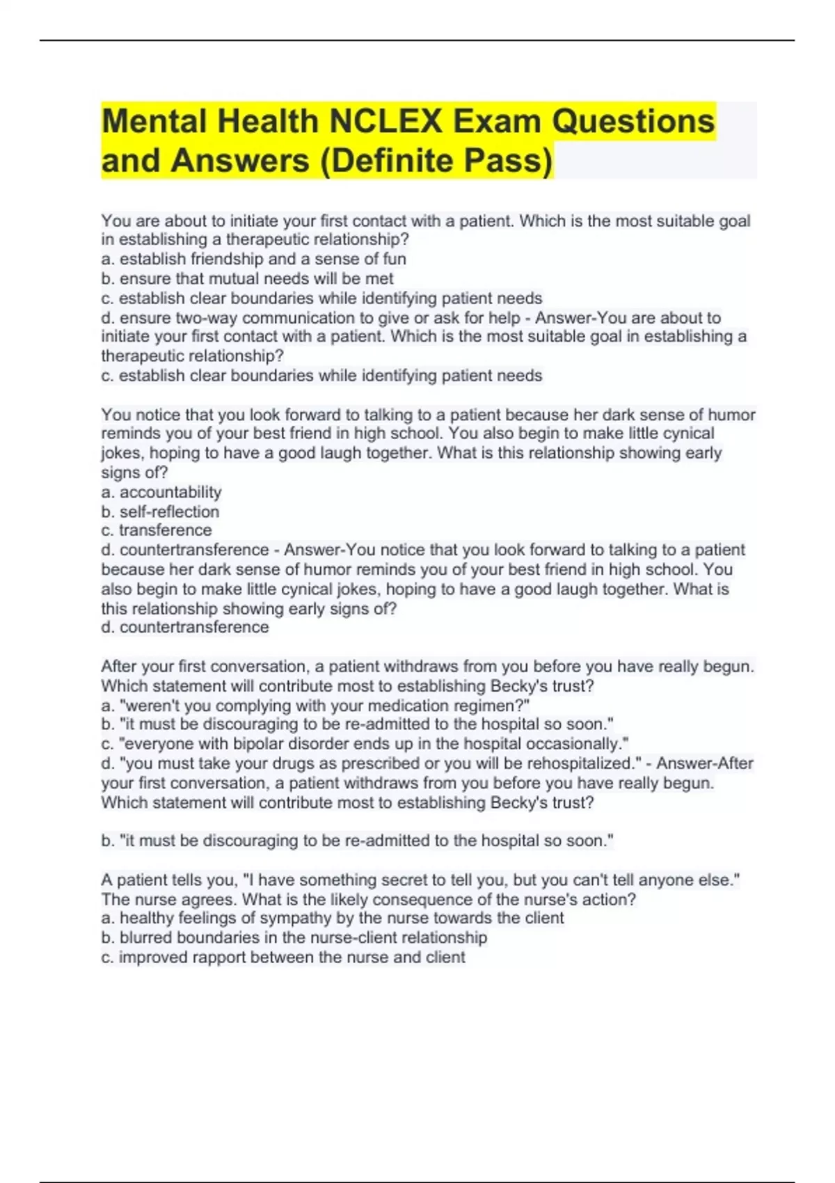 Mental Health NCLEX Exam Questions and Answers (Definite Pass)