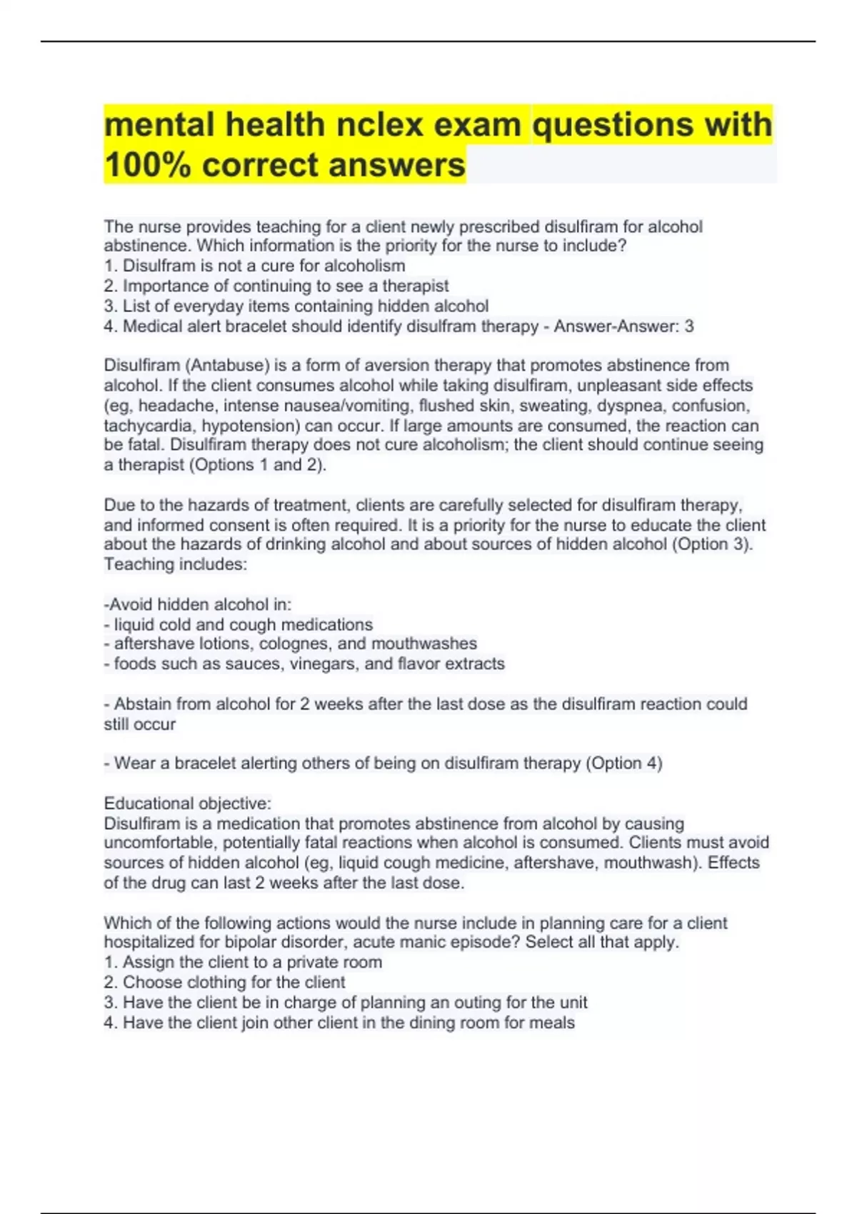 mental health nclex exam questions with 100% correct answers The nurse provides teaching for a client newly prescribed disulfiram for alcohol abstinence. Which information is the priority for the nurse to include? 1. Disulfram is not a cure for alcoholism 2. Importance of continuing to see a therapist 3. List of everyday items containing hidden alcohol 4. Medical alert bracelet should identify disulfram therapy - Answer-Answer: 3 Disulfiram (Antabuse) is a form of aversion therapy that promotes abstinence from alcohol. If the client consumes alcohol while taking disulfiram, unpleasant side effects (eg, headache, intense nausea/vomiting, flushed skin, sweating, dyspnea, confusion, tachycardia, hypotension) can occur. If large amounts are consumed, the reaction can be fatal. Disulfiram therapy does not cure alcoholism; the client should continue seeing a therapist (Options 1 and 2). Due to the hazards of treatment, clients are carefully selected for disulfiram therapy, and informed consent is often required. It is a priority for the nurse to educate the client about the hazards of drinking alcohol and about sources of hidden alcohol (Option 3). Teaching includes: -Avoid hidden alcohol in: - liquid cold and cough medications - aftershave lotions, colognes, and mouthwashes - foods such as sauces, vinegars, and flavor extracts - Abstain from alcohol for 2 weeks after the last dose as the disulfiram reaction could still occur - Wear a bracelet alerting others of being on disulfiram therapy (Option 4) Educational objective: Disulfiram is a medication that promotes abstinence from alcohol by causing uncomfortable, potentially fatal reactions when alcohol is consumed. Clients must avoid sources of hidden alcohol (eg, liquid cough medicine, aftershave, mouthwash). Effects of the drug can last 2 weeks after the last dose. Which of the following actions would the nurse include in planning care for a client hospitalized for bipolar disorder, acute manic episode? Select all that apply. 1. Assign the client to a private room 2. Choose clothing for the client 3. Have the client be in charge of planning an outing for the unit 4. Have the client join other client in the dining room for meals 5. Have the client participate in physical exercise with a staff member 6. Include the client in group therapy sessions - Answer-Answer: 1, 2, 5 In developing a care plan for a client experiencing acute mania, the nurse is aware that an acute manic episode is characterized by the following