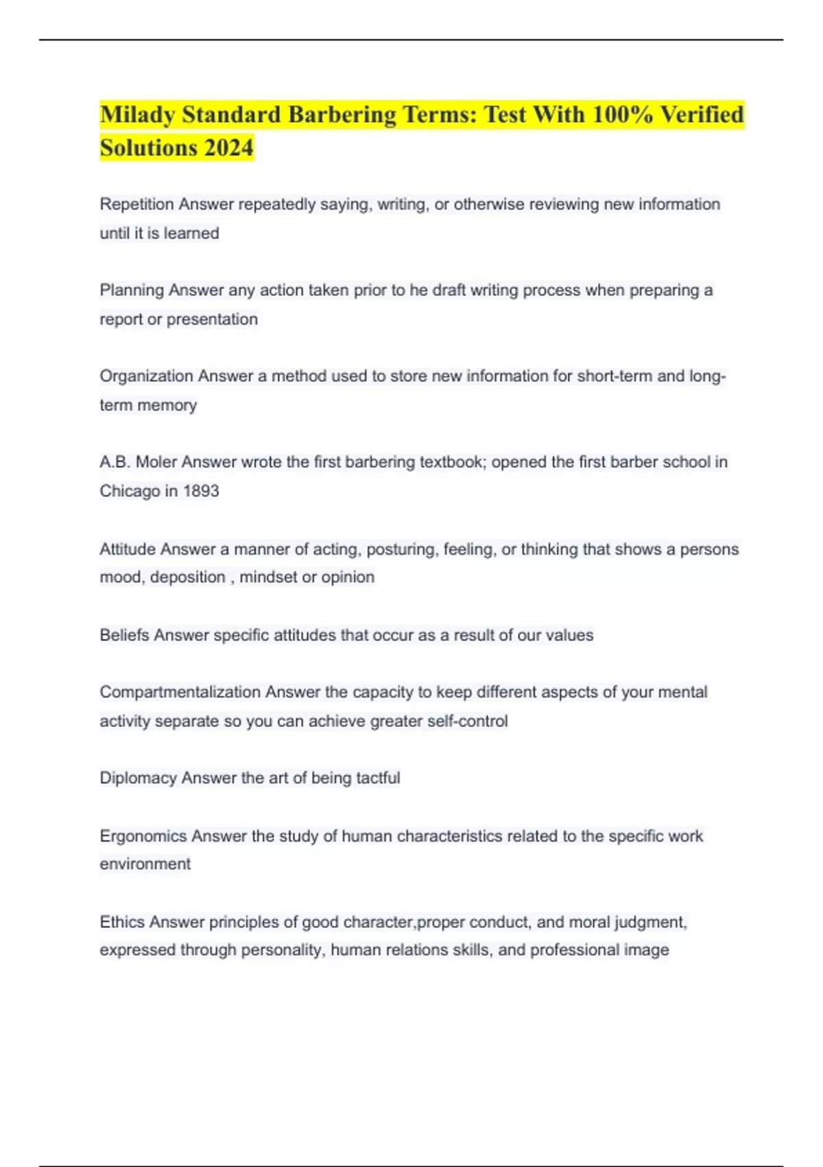 Milady Standard Barbering Terms: Test With 100% Verified Solutions 2024 Repetition Answer repeatedly saying, writing, or otherwise reviewing new information until it is learned Planning Answer any action taken prior to he draft writing process when preparing a report or presentation Organization Answer a method used to store new information for short-term and long-term memory A.B. Moler Answer wrote the first barbering textbook; opened the first barber school in Chicago in 1893 Attitude Answer a manner of acting, posturing, feeling, or thinking that shows a persons mood, deposition , mindset or opinion Beliefs Answer specific attitudes that occur as a result of our values Compartmentalization Answer the capacity to keep different aspects of your mental activity separate so you can achieve greater self-control Diplomacy Answer the art of being tactful Ergonomics Answer the study of human characteristics related to the specific work environment Ethics Answer principles of good character,proper conduct, and moral judgment, expressed through personality, human relations skills, and professional image Goal setting Answer The identification of short and long term goals Life skills Answer tools and guidelines that prepare you for living as an adult in a challenging world Motivation Answer a desire for Change Personal hygiene Answer the daily maintenance of cleanliness and healthfulness thought certain sanitary practices