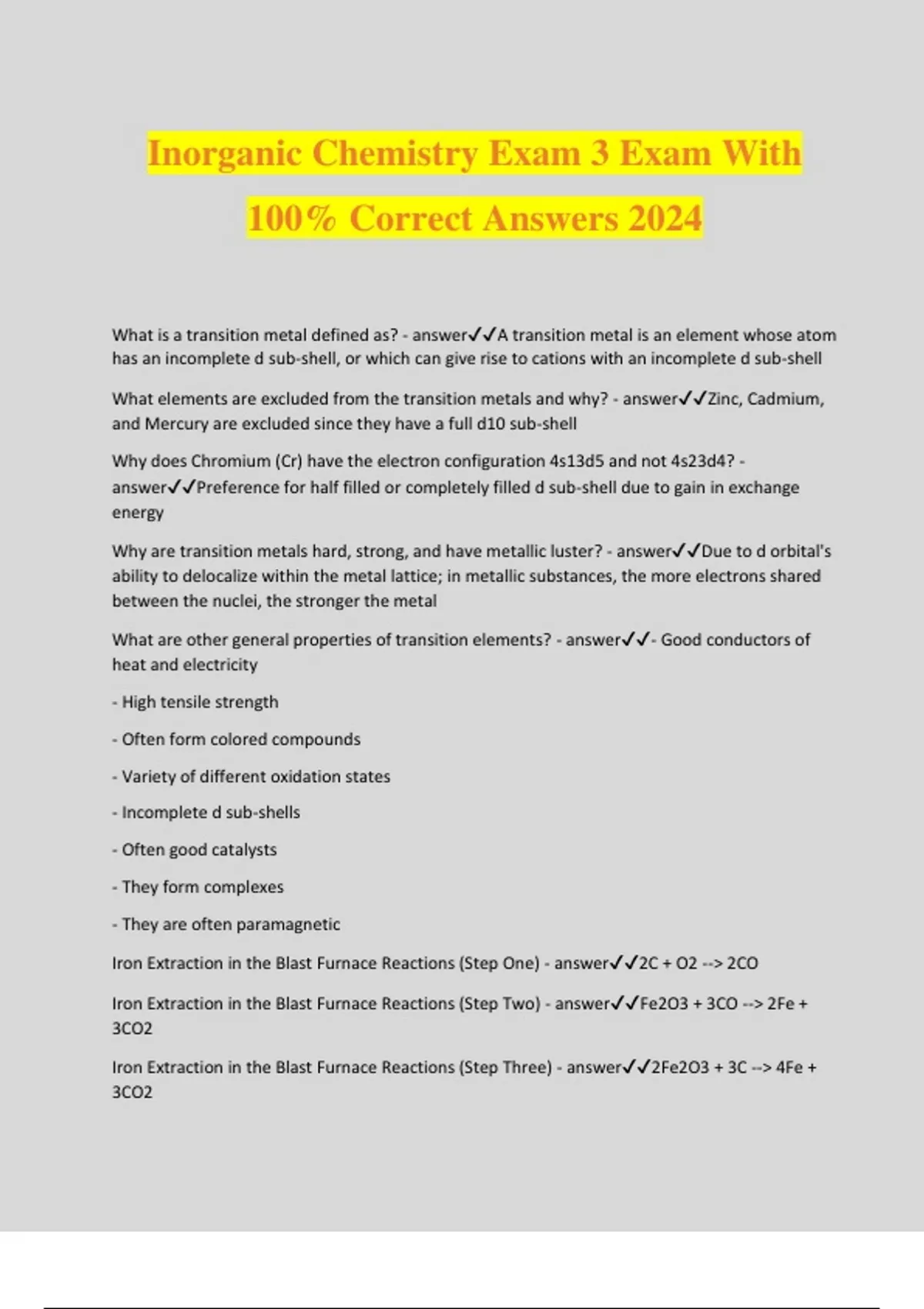 Inorganic Chemistry Exam 3 Exam With 100% Correct Answers 2024 What is a transition metal defined as? - answerA transition metal is an element whose atom has an incomplete d sub-shell, or which can give rise to cations with an incomplete d sub-shell What elements are excluded from the transition metals and why? - answerZinc, Cadmium, and Mercury are excluded since they have a full d10 sub-shell Why does Chromium (Cr) have the electron configuration 4s13d5 and not 4s23d4? - answerPreference for half filled or completely filled d sub-shell due to gain in exchange energy Why are transition metals hard, strong, and have metallic luster? - answerDue to d orbital's ability to delocalize within the metal lattice; in metallic substances, the more electrons shared between the nuclei, the stronger the metal What are other general properties of transition elements? - answer- Good conductors of heat and electricity - High tensile strength - Often form colored compounds - Variety of different oxidation states - Incomplete d sub-shells - Often good catalysts - They form complexes - They are often paramagnetic Iron Extraction in the Blast Furnace Reactions (Step One) - answer2C + O2 --> 2CO Iron Extraction in the Blast Furnace Reactions (Step Two) - answerFe2O3 + 3CO --> 2Fe + 3CO2 Iron Extraction in the Blast Furnace Reactions (Step Three) - answer2Fe2O3 + 3C --> 4Fe + 3CO2 Iron Extraction in the Blast Furnace Reactions (Step Four) - answer2CH4 + O2 --> 2CO + 4H2 Iron Extraction in the Blast Furnace Reactions (Step Five) - answerFe2O3 + CO + 2H2 --> 2Fe + CO2 + 2H2O Pyrolusite (MnO2) Reaction - answerMnO2 + C --> Mn + CO Titanium Kroll Process of Extraction (Chlorination Step) - answerTiO2 + 2C + 2Cl2 --> TiCl4 + 2CO Titanium Kroll Process of Extraction (Reduction Step) - answerTiCl4 + 2Mg --> Ti + 2MgCl2 (1000 degrees Celsius for 2 days) Nickel Extraction Mond Process - answerNiO + H2 --> Ni + H2O Ni + 4CO --> Ni(CO)4 Ni(CO)4 --> Ni + 4CO (Decomposition at high temperature) Pentlandite (FeNi)6S8 reaction - answerNiS + O2 --> NiO + SO2 Vanadium Reaction - answerPbCl2.3Pb3(VO4)2 + Na2CO3 --> NaVO3 --> V2O5 + Ca (C) --> V + CaO What is a coordination compound? - answerThe product of a Lewis acid-base reaction in which neutral molecules or anions (called ligands) bond to a central metal atom (or ion) through coordinate covalent b