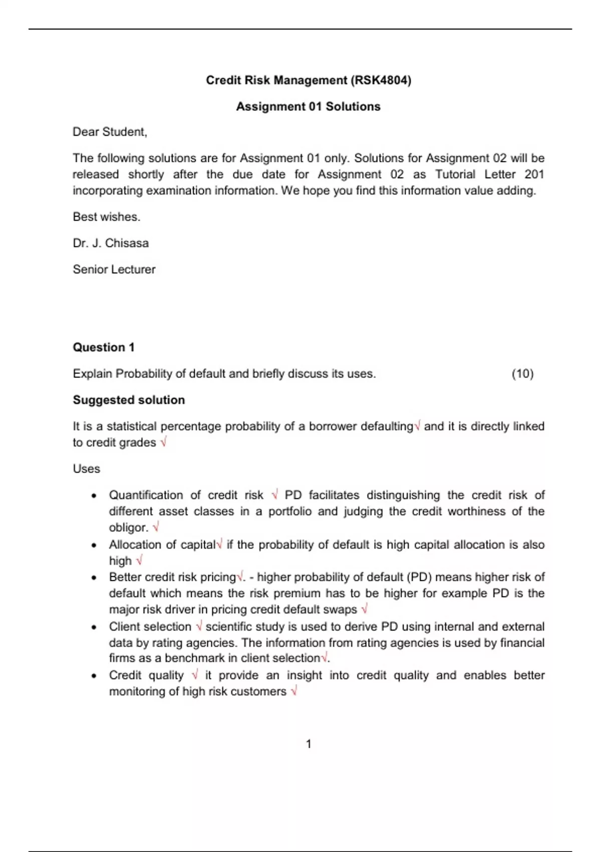 Dear Student, The following solutions are for Assignment 01 only. Solutions for Assignment 02 will be released shortly after the due date for Assignment 02 as Tutorial Letter 201 incorporating examination information. We hope you find this information value adding. Best wishes. Dr. J. Chisasa Senior Lecturer Question 1 Explain Probability of default and briefly discuss its uses. (10) Suggested solution It is a statistical percentage probability of a borrower defaulting√ and it is directly linked to credit grades √ Uses • Quantification of credit risk √ PD facilitates distinguishing the credit risk of different asset classes in a portfolio and judging the credit worthiness of the obligor. √ • Allocation of capital√ if the probability of default is high capital allocation is also high √ • Better credit risk pricing√. - higher probability of default (PD) means higher risk of default which means the risk premium has to be higher for example PD is the major risk driver in pricing credit default swaps √ • Client selection √ scientific study is used to derive PD using internal and external data by rating agencies. The information from rating agencies is used by financial firms as a benchmark in client selection√. • Credit quality √ it provide an insight into credit quality and enables better monitoring of high risk customers √