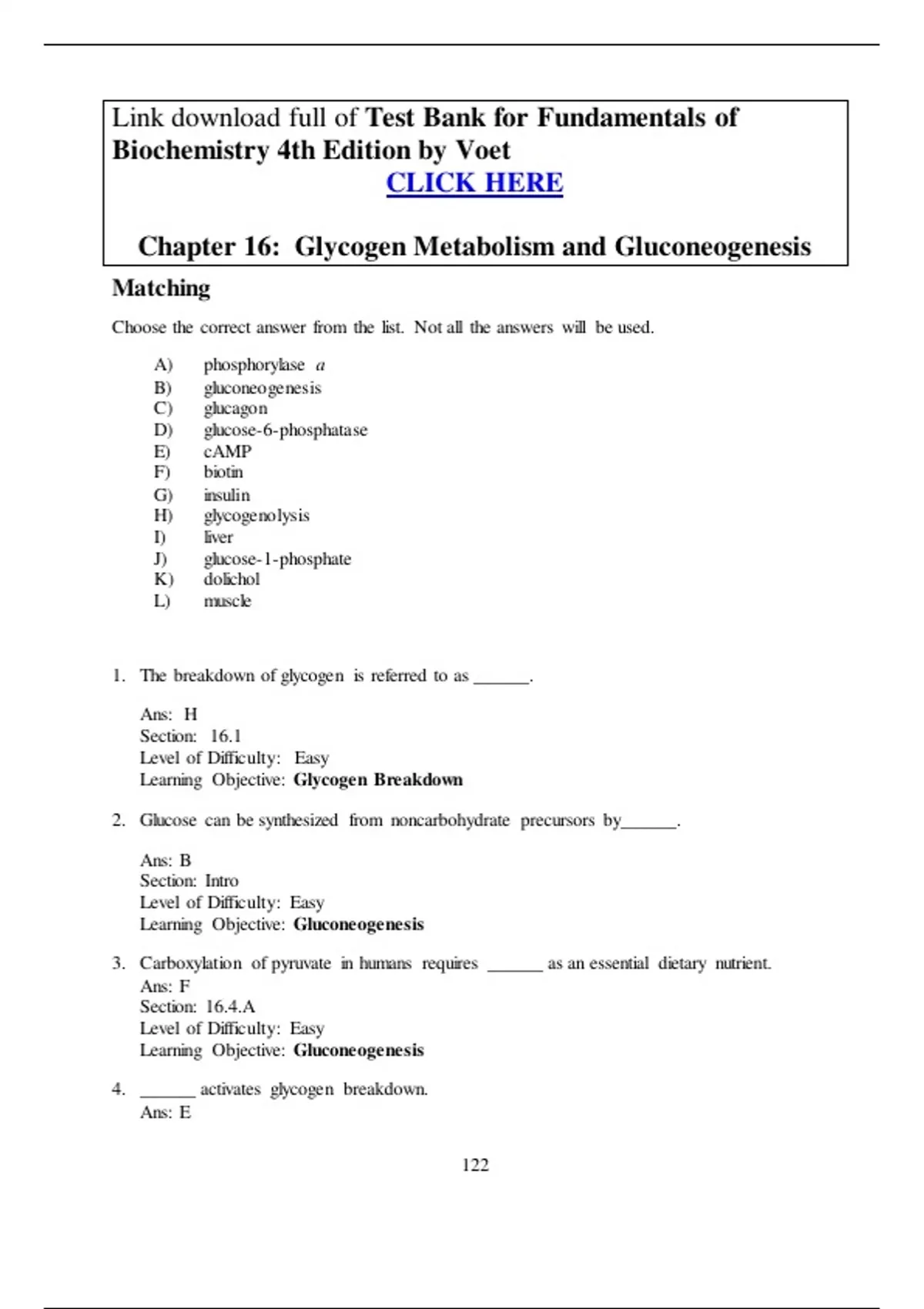 Choose the correct answer from the list. Not all the answers will be used. A) phosphorylase a B) gluconeogenesis C) glucagon D) glucose-6-phosphatase E) cAMP F) biotin G) insulin H) glycogenolysis I) liver J) glucose-1-phosphate K) dolichol L) muscle 1. The breakdown of glycogen is referred to as ______. Ans: H Section: 16.1 Level of Difficulty: Easy Learning Objective: Glycogen Breakdown 2. Glucose can be synthesized from noncarbohydrate precursors by______. Ans: B Section: Intro Level of Difficulty: Easy Learning Objective: Gluconeogenesis 3. Carboxylation of pyruvate in humans requires ______ as an essential dietary nutrient. Ans: F Section: 16.4.A Level of Difficulty: Easy Learning Objective: Gluconeogenesis 4. ______ activates glycogen breakdown. Ans: E full file at full file at Section: 16.3.B Level of Difficulty: Easy Learning Objective: Control of Glycogen Metabolism 5. An enzyme present in the endoplasmic reticulum of liver cells is ______. Ans: D Section: 16.1.C Level of Difficulty: Moderate Learning Objective: Glycogen Breakdown 6. ______ cells lack receptors for the hormone glucagon. Ans: L Section: 16.3.C Level of Difficulty: Easy Learning Objective: Control of Glycogen Metabolism 7. Low blood glucose (< 5mM) levels result in the release of ______. Ans: C Section: 16.3.C Level of Difficulty: Easy Learning Objective: Control of Glycogen Metabolism 8. The first step in the breakdown of glycogen is catalyzed by ______. Ans: A Section: 16.1.A Level of Difficulty: Easy Learning Objective: Glycogen Breakdown