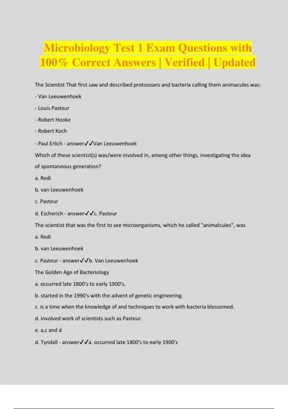 Microbiology Test 1 Exam Questions with 100% Correct Answers | Verified | Updated The Scientist That first saw and described protozoans and bacteria calling them animacules was: - Van Leeuwenhoek - Louis Pasteur - Robert Hooke - Robert Koch - Paul Erlich - answerVan Leeuwenhoek Which of these scientist(s) was/were involved in, among other things, investigating the idea of spontaneous generation? a. Redi b. van Leeuwenhoek c. Pasteur d. Escherich - answerc. Pasteur The scientist that was the first to see microorganisms, which he called "animalcules", was a. Redi b. van Leeuwenhoek c. Pasteur - answerb. Van Leeuwenhoek The Golden Age of Bacteriology a. occurred late 1800's to early 1900's. b. started in the 1990's with the advent of genetic engineering. c. is a time when the knowledge of and techniques to work with bacteria blossomed. d. involved work of scientists such as Pasteur. e. a,c and d d. Tyndall - answera. occurred late 1800's to early 1900's The person responsible for proving that a Specific disease was caused by a specific microorganism - Louis Pasteur - Robert Koch - Antony Van Leeuwenhoek - Robert Hooke - Alexander Fleming - answerRobert Koch Pasteur's experiment demonstrated that microorganisms in the __________ were indistinguishable from those that grew in contaminated broth contained in the flasks. - Broth - Air - Soil - Water - corks - answer-Air The idea of spontaneous generation postulated that - Organisms could evolve into the next generation of organisms - Organisms could spontaneously combust - Organisms could spontaneously arise from other living organisms - Organisms could spontaneously arise from non living material - answerOrganisms could spontaneously arise from non living material Plants are dependent on microorganisms a. providing oxygen. b. providing water. c. changing atmospheric nitrogen to a usable form. d. providing carbohydrates. - answerc. changing atmospheric nitrogen to a usable form. Which of the following is
