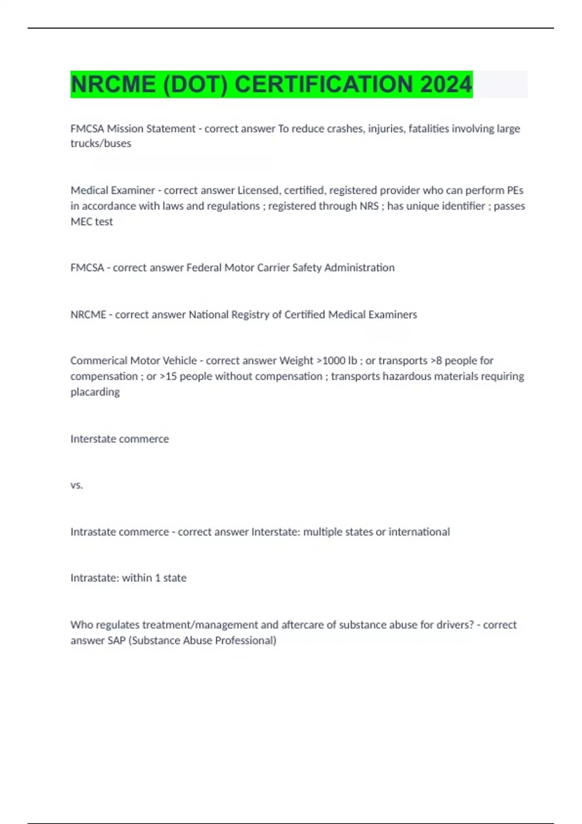 NRCME (DOT) CERTIFICATION 2024 FMCSA Mission Statement - correct answer To reduce crashes, injuries, fatalities involving large trucks/buses Medical Examiner - correct answer Licensed, certified, registered provider who can perform PEs in accordance with laws and regulations ; registered through NRS ; has unique identifier ; passes MEC test FMCSA - correct answer Federal Motor Carrier Safety Administration NRCME - correct answer National Registry of Certified Medical Examiners
