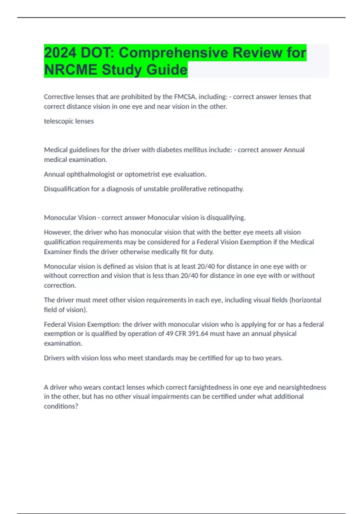 2024 DOT: Comprehensive Review for NRCME Study Guide Corrective lenses that are prohibited by the FMCSA, including: - correct answer lenses that correct distance vision in one eye and near vision in the other. telescopic lenses Medical guidelines for the driver with diabetes mellitus include: - correct answer Annual medical examination. Annual ophthalmologist or optometrist eye evaluation. Disqualification for a diagnosis of unstable proliferative retinopathy.