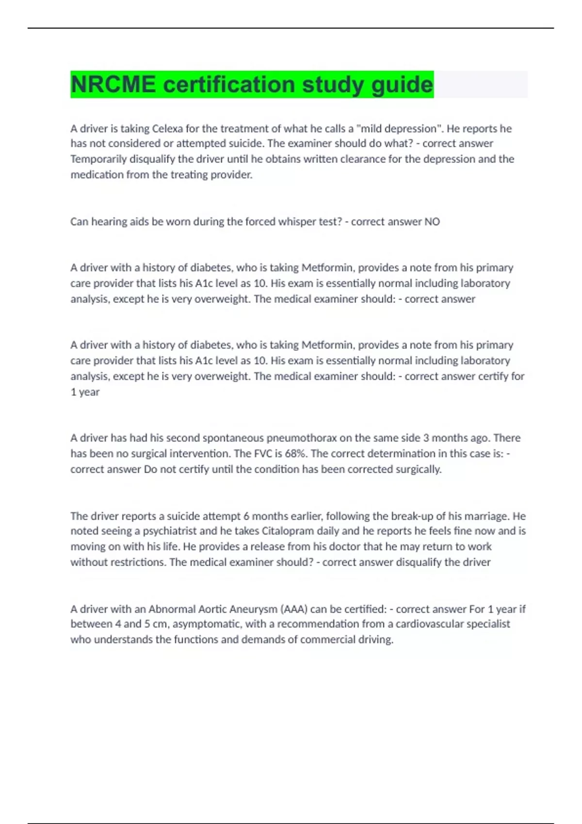 NRCME certification study guide A driver is taking Celexa for the treatment of what he calls a "mild depression". He reports he has not considered or attempted suicide. The examiner should do what? - correct answer Temporarily disqualify the driver until he obtains written clearance for the depression and the medication from the treating provider. Can hearing aids be worn during the forced whisper test? - correct answer NO