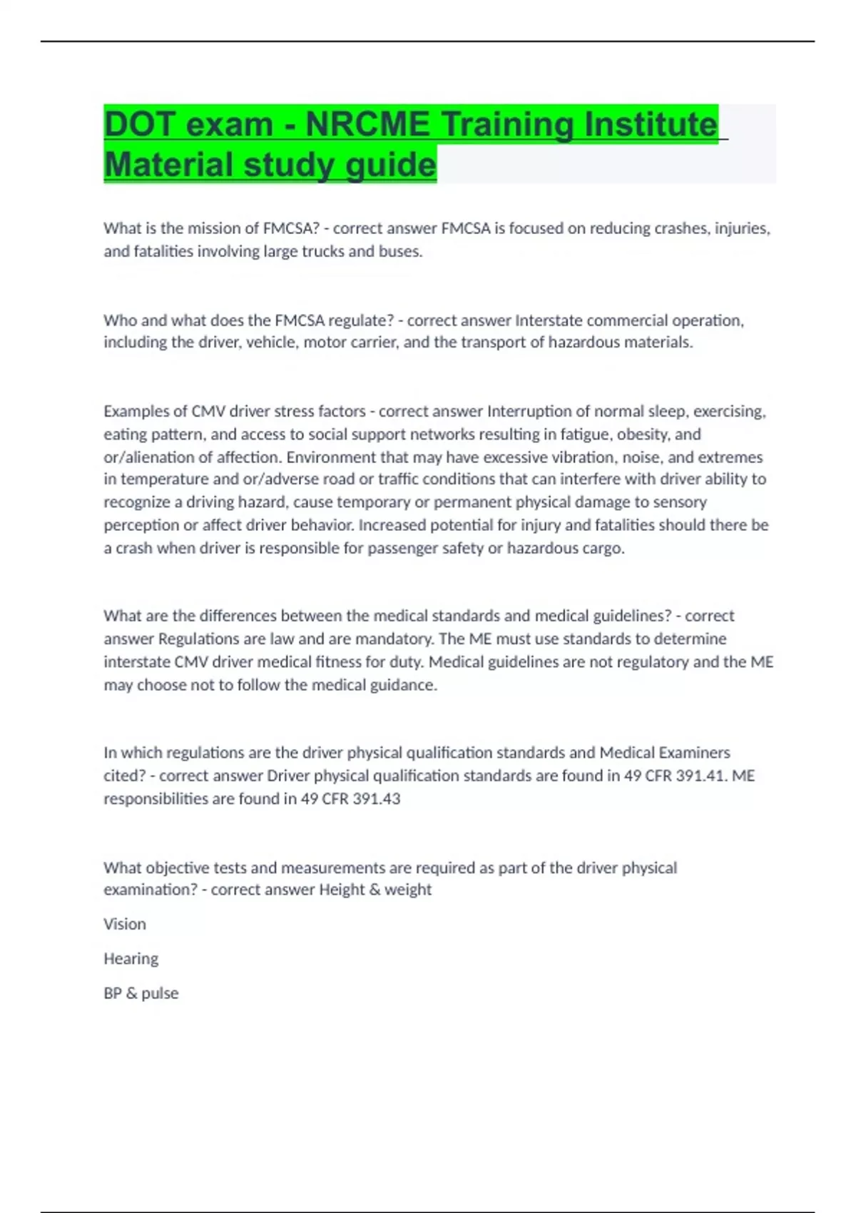 DOT exam - NRCME Training Institute Material study guide