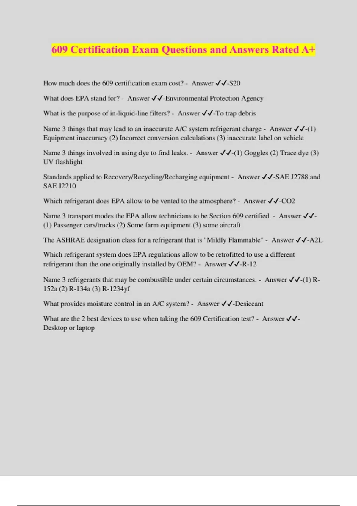 609 Certification Exam Questions and Answers Rated A+ How much does the 609 certification exam cost? - Answer ️️ -$20 What does EPA stand for? - Answer ️️ -Environmental Protection Agency What is the purpose of in-liquid-line filters? - Answer ️️ -To trap debris Name 3 things that may lead to an inaccurate A/C system refrigerant charge - Answer ️️ -(1) Equipment inaccuracy (2) Incorrect conversion calculations (3) inaccurate label on vehicle Name 3 things involved in using dye to find leaks. - Answer ️️ -(1) Goggles (2) Trace dye (3) UV flashlight Standards applied to Recovery/Recycling/Recharging equipment - Answer ️️ -SAE J2788 and SAE J2210 Which refrigerant does EPA allow to be vented to the atmosphere? - Answer ️️ -CO2