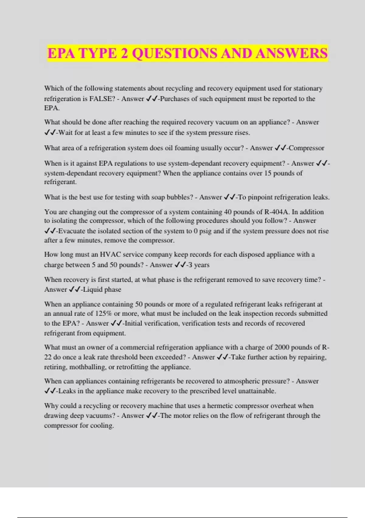 EPA TYPE 2 QUESTIONS AND ANSWERS Which of the following statements about recycling and recovery equipment used for stationary refrigeration is FALSE? - Answer ️️ -Purchases of such equipment must be reported to the EPA. What should be done after reaching the required recovery vacuum on an appliance? - Answer ️️ -Wait for at least a few minutes to see if the system pressure rises. What area of a refrigeration system does oil foaming usually occur? - Answer ️️ -Compressor When is it against EPA regulations to use system-dependant recovery equipment? - Answer ️️ - system-dependant recovery equipment? When the appliance contains over 15 pounds of refrigerant. What is the best use for testing with soap bubbles? - Answer ️️ -To pinpoint refrigeration leaks. You are changing out the compressor of a system containing 40 pounds of R-404A. In addition to isolating the compressor, which of the following procedures should you follow? - Answer ️️ -Evacuate the isolated section of the system to 0 psig and if the system pressure does not rise after a few minutes, remove the compressor. How long must an HVAC service company keep records for each disposed appliance with a charge between 5 and 50 pounds? - Answer ️️ -З years When recovery is first started, at what phase is the refrigerant removed to save recovery time? - Answer ️️ -Liquid phase When an appliance containing 50 pounds or more of a regulated refrigerant leaks refrigerant at an annual rate of 125% or more, what must be included on the leak inspection records submitted to the EPA? - Answer ️️ -Initial verification, verification tests and records of recovered refrigerant from equipment. What must an owner of a commercial refrigeration appliance with a charge of 2000 pounds of R- 22 do once a leak rate threshold been exceeded? - Answer ️️ -Take further action by repairing, retiring, mothballing, or retrofitting the appliance. When can appliances containing refrigerants be recovered to atmospheric pressure? - Answer ️️ -Leaks in the appliance make recovery to the prescribed level unattainable. Why could a recycling or recovery machine that uses a hermetic compressor overheat when drawing deep vacuums? - Answer ️️ -The motor relies on the flow of refrigerant through the compressor for cooling. Starting in 2019, what leak rate triggers the EPA requirement that commercial refrigeration systems containing 50 pounds or more of R-22 be repaired? - Answer ️️ -20% For what refrigerant is an equipment room refrigerant detector NOT required under ASHRAE Standard 15 provided the mechanical ventilation system in the machinery room is run continuously? - Answer ️️ -R-717 Industrial process refrigeration units with a 50 pound charge or more with an annualized leak rate ___of or more must have leaks repaired. - Answer ️️ -30% Unless plans are made to replace a system exceeding the maximum leak, repairs must be made in; - Answer ️️ -30 days. Refrigerants CFC R-12, HCFC R-22, and HFC 134a are all classified as; - Answer ️️ -Туре А- 1 All Refrigeration & HVAC systems are protected by a; - Answer ️️ -Pressure relief valve A refrigerant sensor which will sound an alarm and automatically start a ventilation system in occupied equipment rooms fall under; - Answer ️️ -ASHRAE Standard 15 Non-condensables will cause; - Answer ️️ -High discharge pressure A crankcase heater is often used to prevent refrigerant from migrating to the oil during periods of: - Answer ️️ -Low ambient temperature EPA regulations state that maintenance, service or repair involving the removal of the following component is a "major repair" - Answer ️️ -Compressor Which of the following refrigerants is an HFO? - Answer ️️ -R-1234YF What can be done with the refrigerant trace gas and nitrogen after the leak is found? - Answer ️️ -Release to the atmosphere. When dehydrating a system it should be evacuated to a level of; - Answer ️️ -500 Microns Refrigerant should be removed from the condenser outlet if the condenser is; - Answer ️️ - Below the receiver What happens to a refrigerant that is above the saturation temperature? - Answer ️️ -It remains in a vapor stat