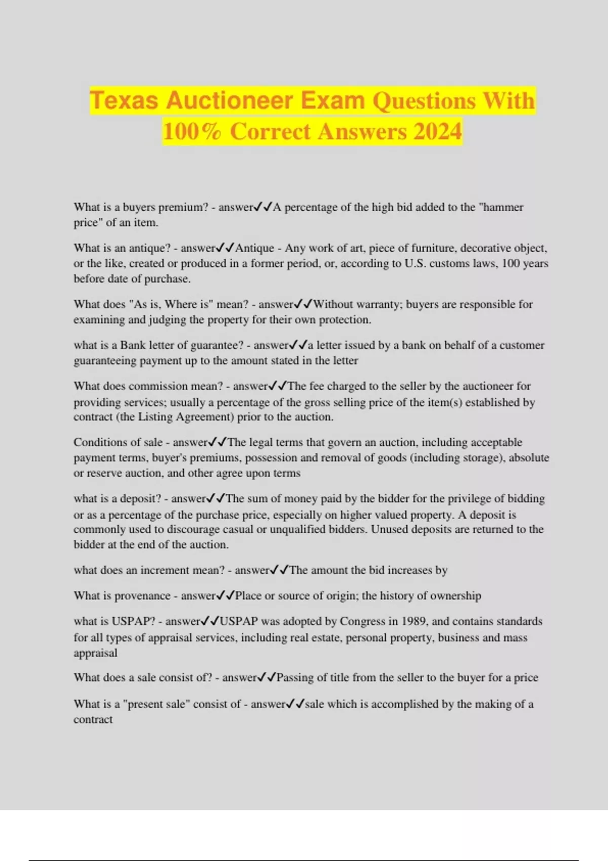 Texas Auctioneer Exam Questions With 100% Correct Answers 2024 What is a buyers premium? - answerA percentage of the high bid added to the "hammer price" of an item. What is an antique? - answerAntique - Any work of art, piece of furniture, decorative object, or the like, created or produced in a former period, or, according to U.S. customs laws, 100 years before date of purchase. What does "As is, Where is" mean? - answerWithout warranty; buyers are responsible for examining and judging the property for their own protection. what is a Bank letter of guarantee? - answera letter issued by a bank on behalf of a customer guaranteeing payment up to the amount stated in the letter What does commission mean? - answerThe fee charged to the seller by the auctioneer for providing services; usually a percentage of the gross selling price of the item(s) established by contract (the Listing Agreement) prior to the auction. Conditions of sale - answerThe legal terms that govern an auction, including acceptable payment terms, buyer's premiums, possession and removal of goods (including storage), absolute or reserve auction, and other agree upon terms what is a deposit? - answerThe sum of money paid by the bidder for the privilege of bidding or as a percentage of the purchase price, especially on higher valued property. A deposit is commonly used to discourage casual or unqualified bidders. Unused deposits are returned to the bidder at the end of the auction. what does an increment mean? - answerThe amount the bid increases by What is provenance - answerPlace or source of origin; the history of ownership what is USPAP? - answerUSPAP was adopted by Congress in 1989, and contains standards for all types of appraisal services, in