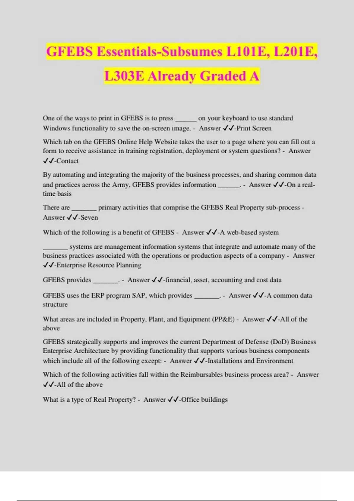 GFEBS Essentials-Subsumes L101E, L201E, L303E Already Graded A One of the ways to print in GFEBS is to press ______ on your keyboard to use standard Windows functionality to save the on-screen image. - Answer ️️ -Print Screen Which tab on the GFEBS Online Help Website takes the user to a page where you can fill out a form to receive assistance in training registration, deployment or system questions? - Answer ️️ -Contact By automating and integrating the majority of the business processes, and sharing common data and practices across the Army, GFEBS provides information ______. - Answer ️️ -On a real- time basis There are _______ primary activities that comprise the GFEBS Real Property sub-process - Answer ️️ -Seven Which of the following is a benefit of GFEBS - Answer ️️ -A web-based system _______ systems are management information systems that integrate and automate many of the business practices associated with the operations or production aspects of a company - Answer ️️ -Enterprise Resource Planning GFEBS provides _______. - Answer ️️ -financial, asset, accounting and cost data GFEBS uses the ERP program SAP, which provides _______. - Answer ️️ -A common data structure What areas are included in Property, Plant, and Equipment (PP&E) - Answer ️️ -All of the above GFEBS strategically supports and improves the current Department of Defense (DoD) Business Enterprise Architecture by providing functionality that supports various business components which include all of the following except: - Answer ️️ -Installations and Environment Which of the following activities fall within the Reimbursables business process area? - Answer ️️ -All of the above What is a type of Real Property? - Answer ️️ -Office buildings