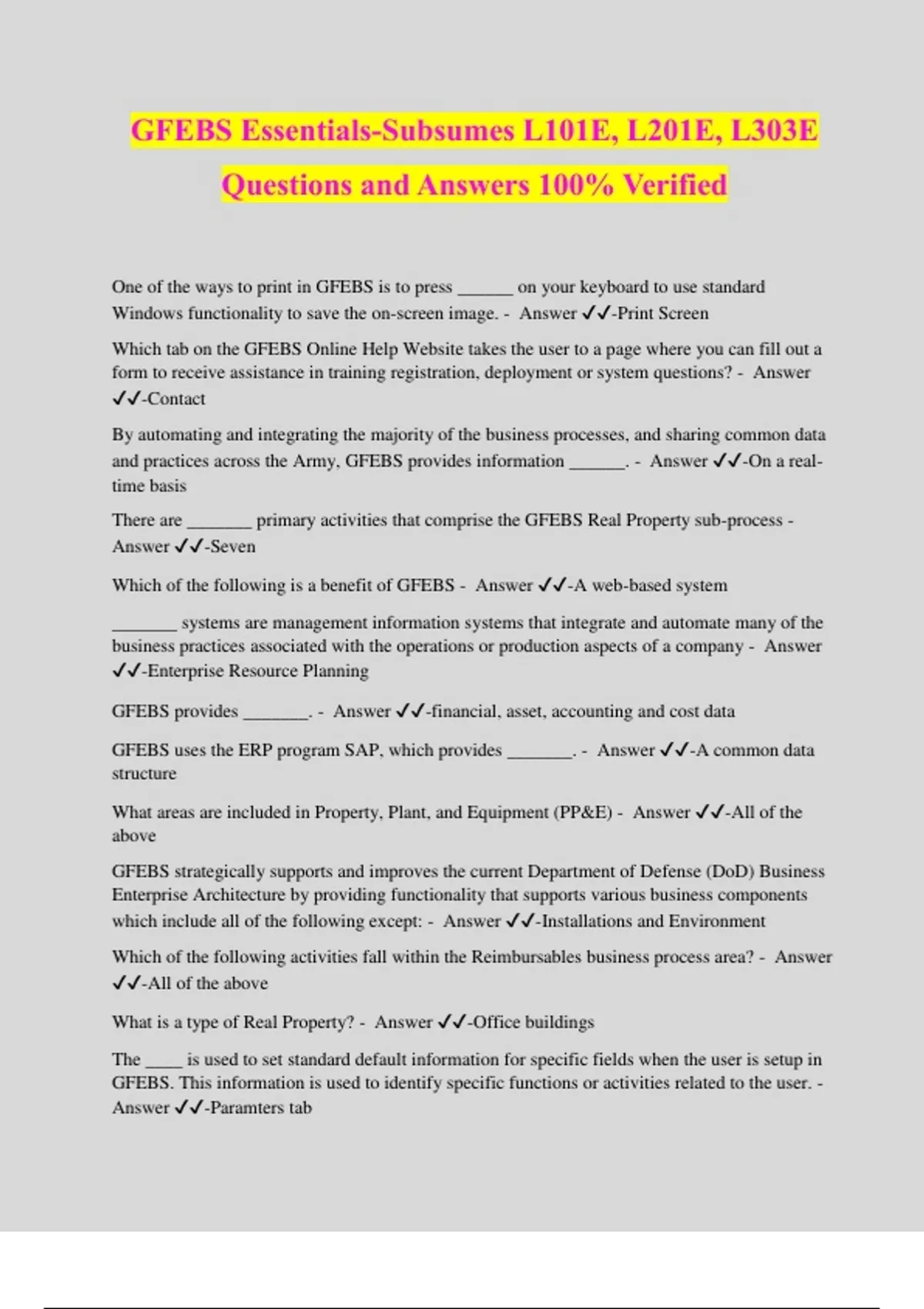GFEBS Essentials-Subsumes L101E, L201E, L303E Questions and Answers 100% Verified One of the ways to print in GFEBS is to press ______ on your keyboard to use standard Windows functionality to save the on-screen image. - Answer ️️ -Print Screen Which tab on the GFEBS Online Help Website takes the user to a page where you can fill out a form to receive assistance in training registration, deployment or system questions? - Answer ️️ -Contact By automating and integrating the majority of the business processes, and sharing common data and practices across the Army, GFEBS provides information ______. - Answer ️️ -On a real- time basis There are _______ primary activities that comprise the GFEBS Real Property sub-process - Answer ️️ -Seven Which of the following is a benefit of GFEBS - Answer ️️ -A web-based system _______ systems are management information systems that integrate and automate many of the business practices associated with the operations or production aspects of a company - Answer ️️ -Enterprise Resource Planning GFEBS provides _______. - Answer ️️ -financial, asset, accounting and cost data GFEBS uses the ERP program SAP, which provides _______. - Answer ️️ -A common data structure What areas are included in Property, Plant, and Equipment (PP&E) - Answer ️️ -All of the above GFEBS strategically supports and improves the current Department of Defense (DoD) Business Enterprise Architecture by providing functionality that supports various business components which include all of the following except: - Answer ️️ -Installations and Environment Which of the following activities fall within the Reimbursables business process area? - Answer ️️ -All of the above What is a type of Real Property? - Answer ️️ -Office buildings The ____ is used to set standard default information for specific fields when the user is setup in GFEBS. This information is used to identify specific functions or activities related to the user. - Answer ️️ -Paramters tab