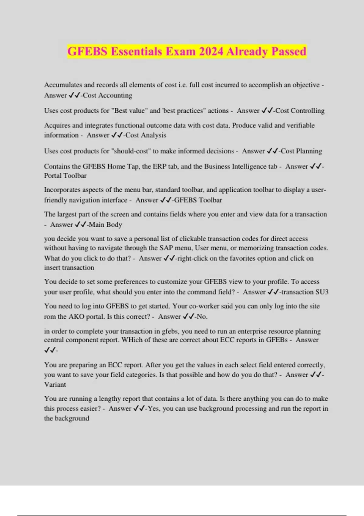 GFEBS Essentials Exam 2024 Already Passed Accumulates and records all elements of cost i.e. full cost incurred to accomplish an objective - Answer ️️ -Cost Accounting Uses cost products for "Best value" and 'best practices" actions - Answer ️️ -Cost Controlling Acquires and integrates functional outcome data with cost data. Produce valid and verifiable information - Answer ️️ -Cost Analysis Uses cost products for "should-cost" to make informed decisions - Answer ️️ -Cost Planning Contains the GFEBS Home Tap, the ERP tab, and the Business Intelligence tab - Answer ️️ - Portal Toolbar Incorporates aspects of the menu bar, standard toolbar, and application toolbar to display a user- friendly navigation interface - Answer ️️ -GFEBS Toolbar The largest part of the screen and contains fields where you enter and view data for a transaction - Answer ️️ -Main Body you decide you want to save a personal list of clickable transaction codes for direct access without having to navigate through the SAP menu, User menu, or memorizing transaction codes. What do you click to do that? - Answer ️️ -right-click on the favorites option and click on insert transaction